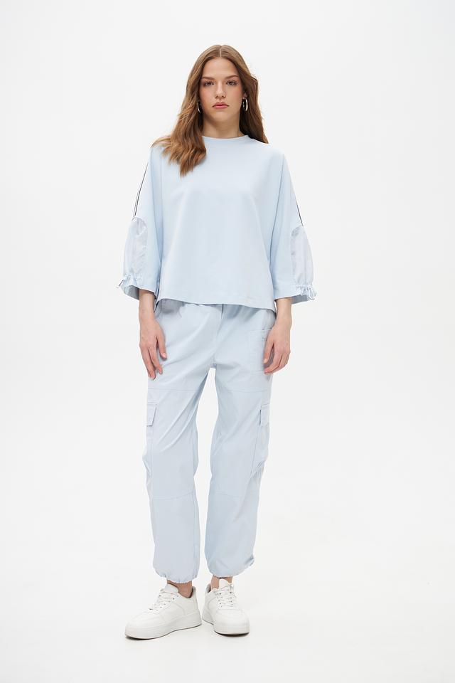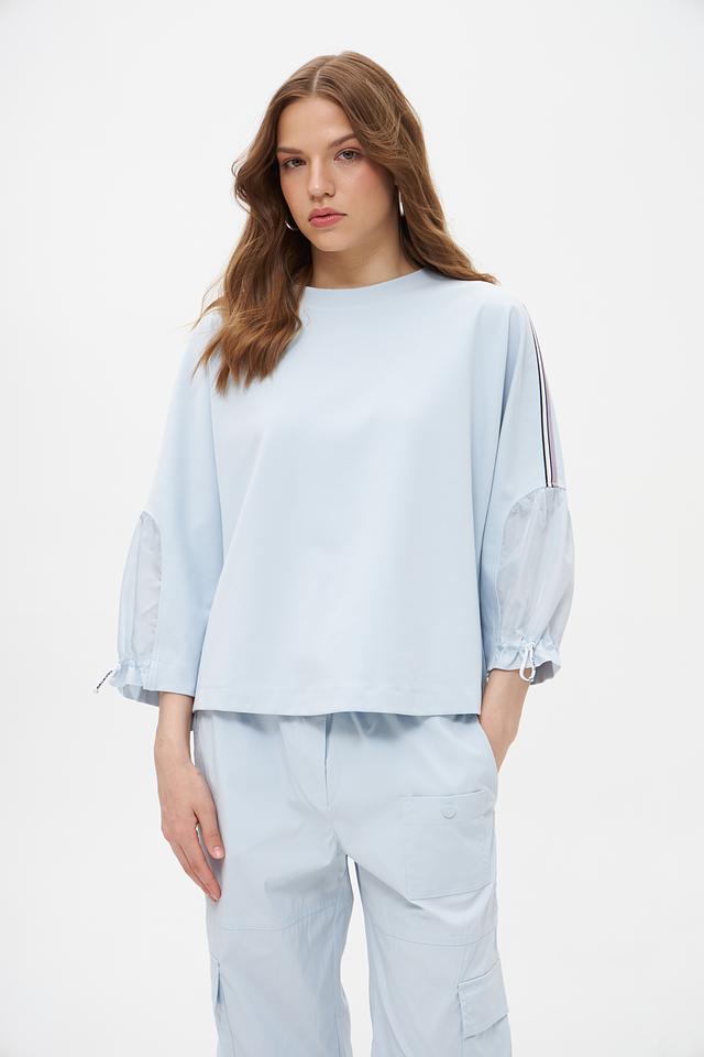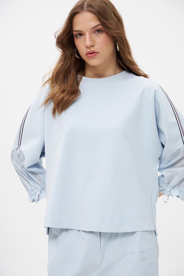 Особенностью модели являются рукава-фонарики с небольшими сборками и манжетами на завязках, а также декоративные полосы по бокам. Круглый вырез горловины и лаконичный дизайн делают этот пуловер универсальным и подходящим для различных образов.