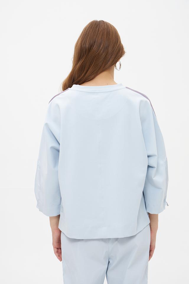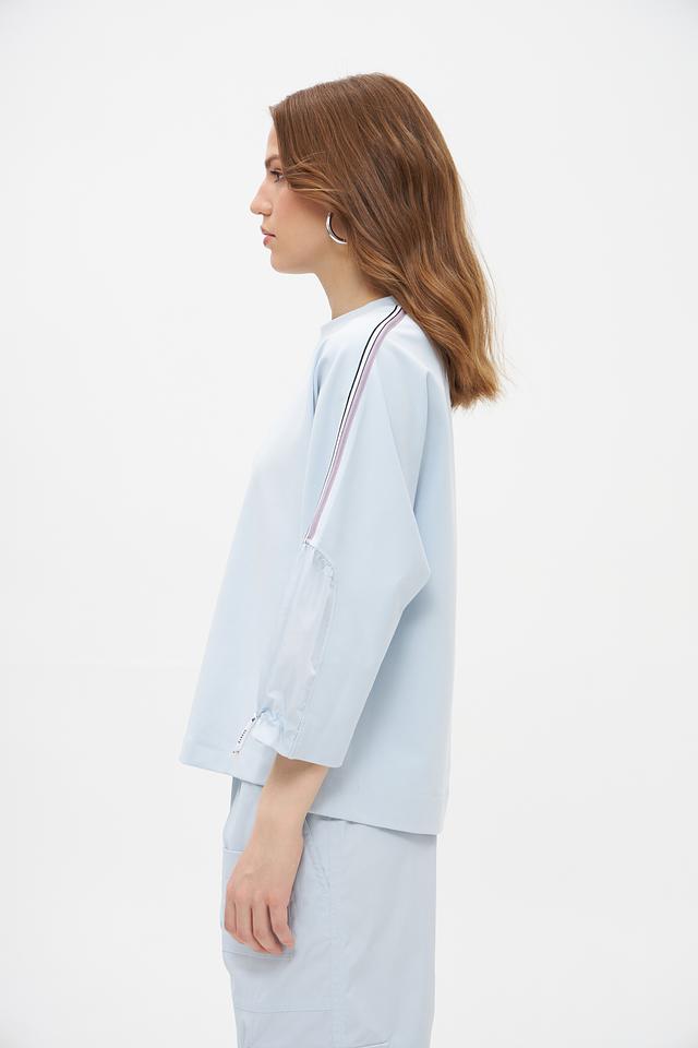 Женский пуловер Marc Cain голубого цвета с рукавами-фонариками и декоративными полосами. Модель выполнена из мягкого и приятного к телу сочетания хлопка, модала и эластана, обеспечивающего комфорт при носке. Состав: хлопок 47%, модал 47%, эластан 6%