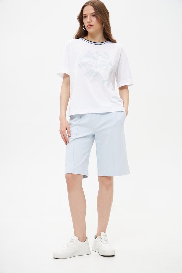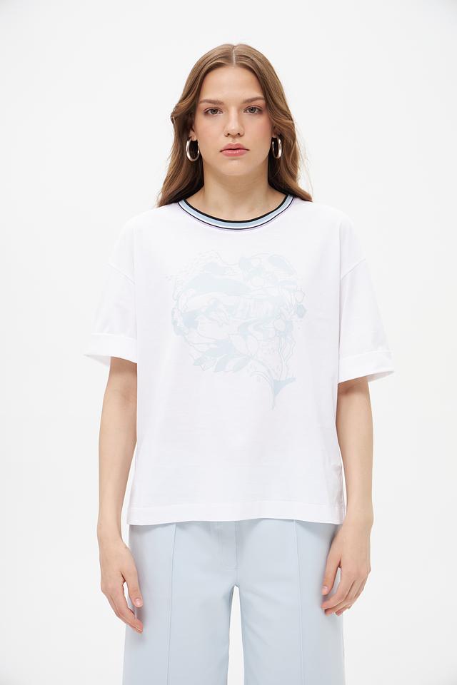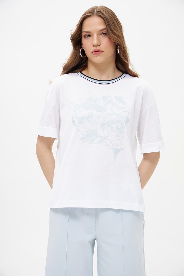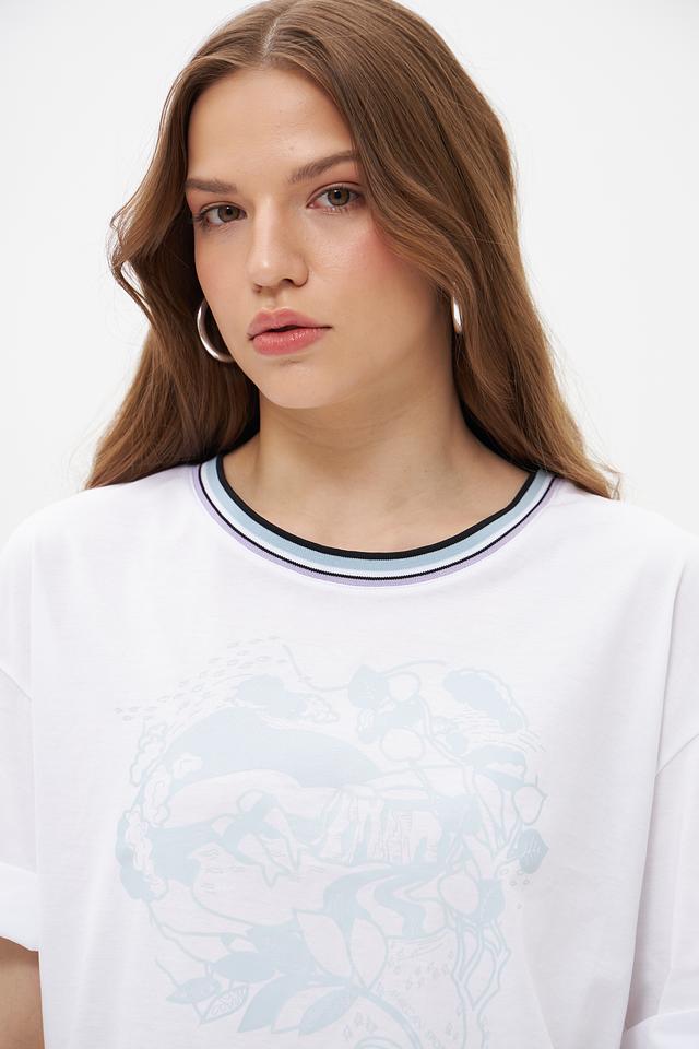 Особенностью данной модели является яркий голубой принт, который добавляет образу оригинальности и свежести. Футболка имеет свободный крой, что обеспечивает свободу движений и позволяет создавать различные стильные сочетания.