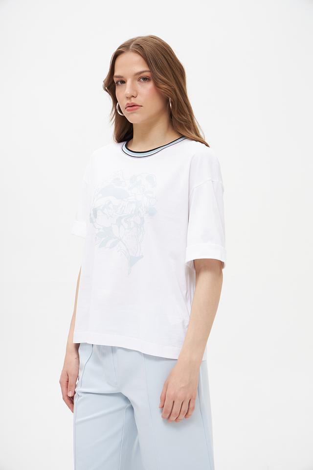 Ворот имеет отделку тонкой полоской в сине-черную полоску. Эта футболка идеально подойдет для создания повседневных образов, а также для активного отдыха. Она легко сочетается с джинсами, шортами, юбками и другими элементами гардероба.