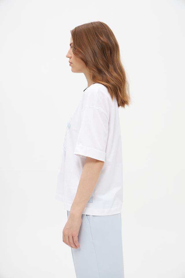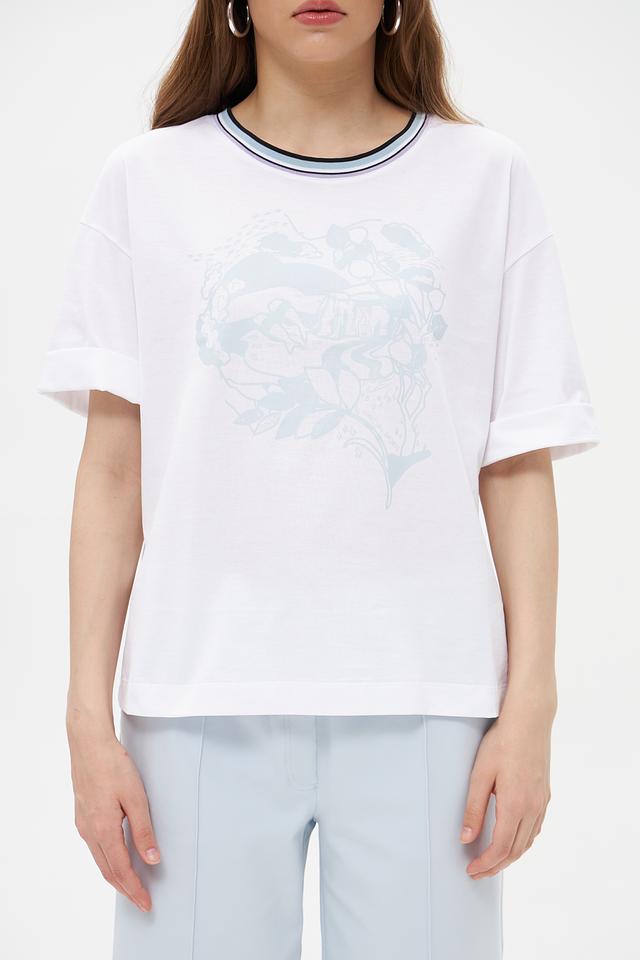 Белая футболка Marc Cain с оригинальным голубым принтом — стильное и комфортное решение для повседневного образа. Изготовлена из 100% хлопка, обеспечивающего приятные ощущения на коже. Состав: хлопок 100%