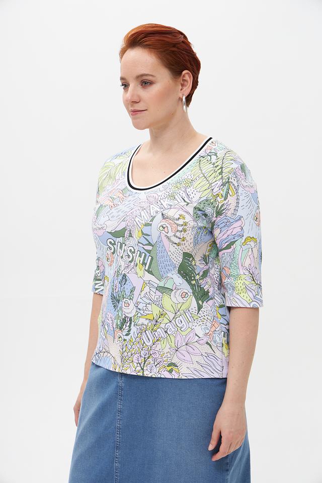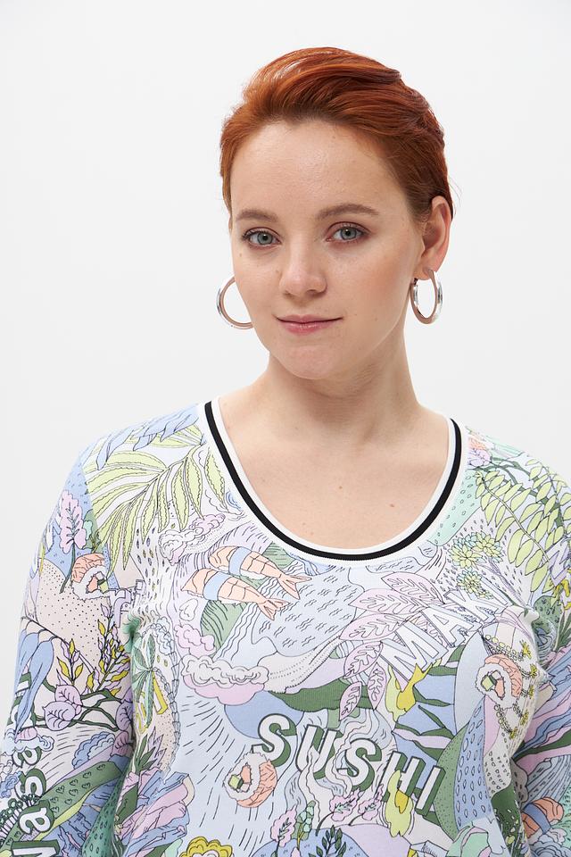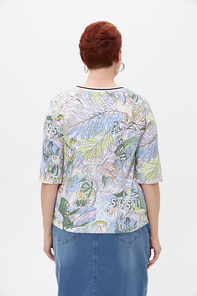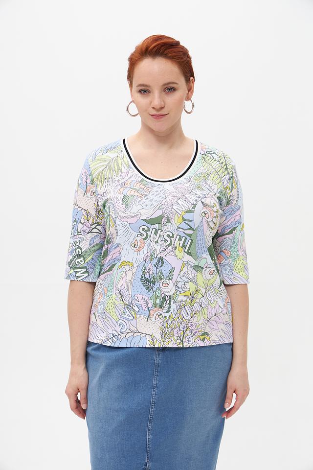 Белая футболка Marc Cain с ярким принтом в виде суши и растительных элементов. Изготовлена из мягкого хлопка с добавлением эластана для комфортной посадки. Оригинальный дизайн для создания стильного образа. Состав: хлопок 94%, эластан 6%