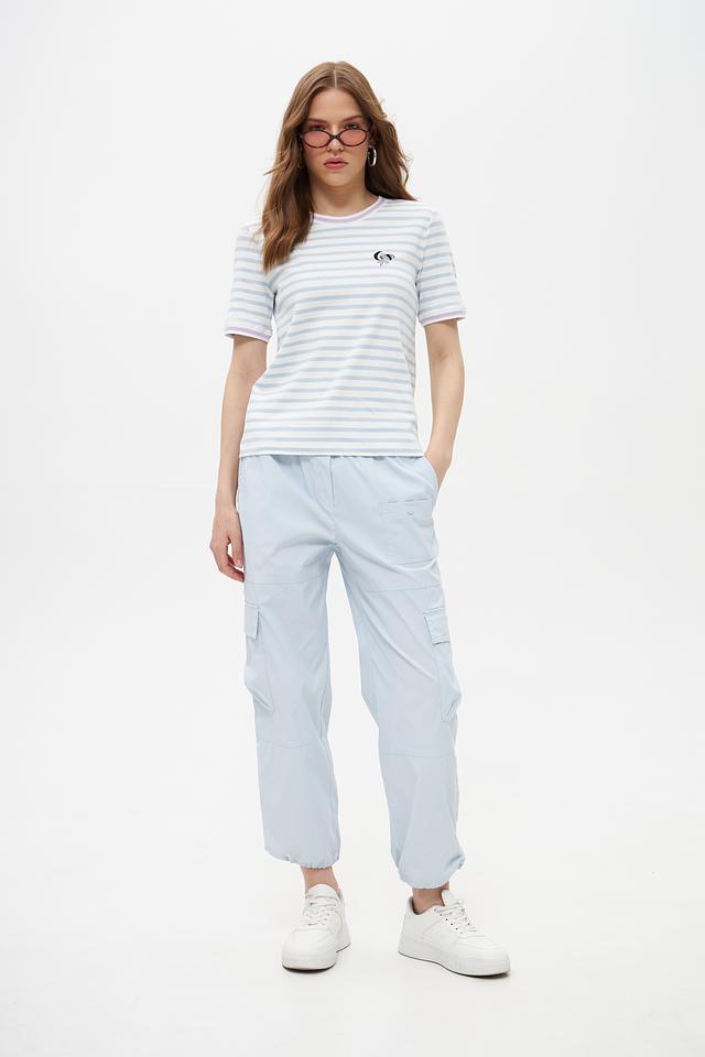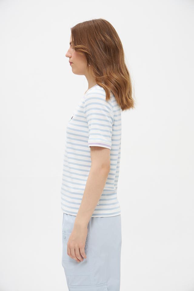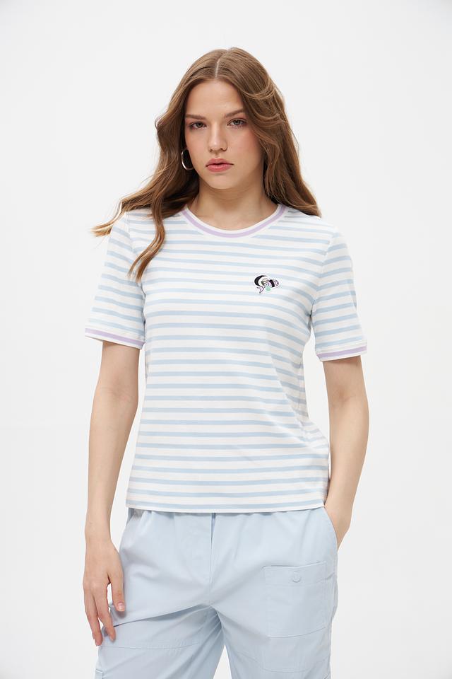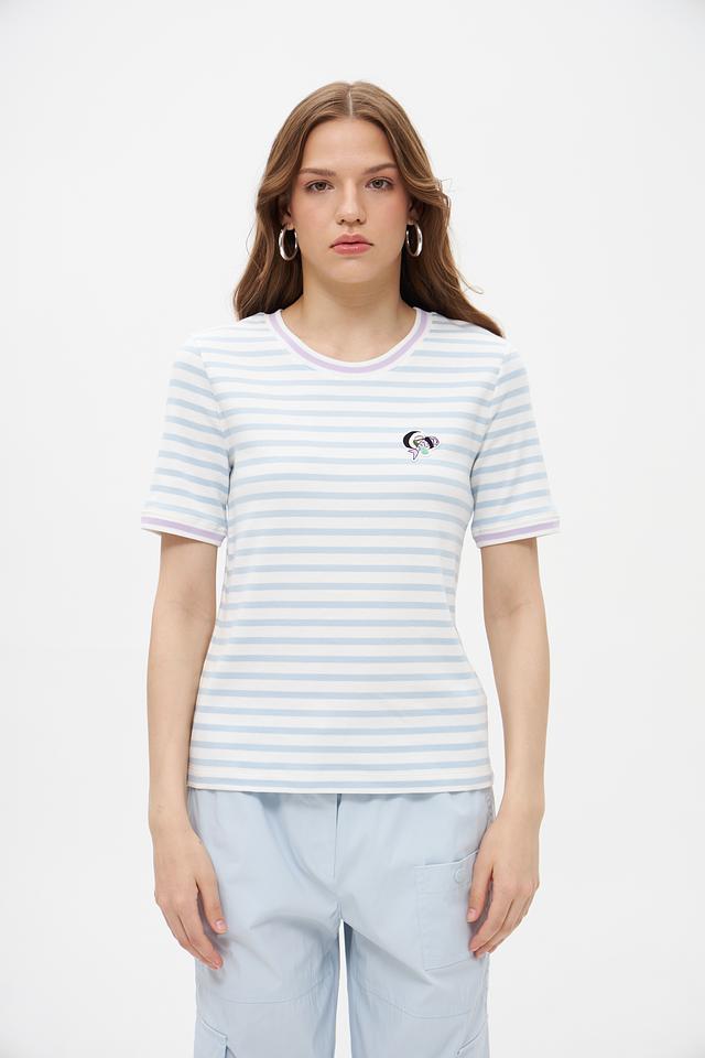 Футболка имеет классический крой с короткими рукавами и круглым вырезом горловины. Голубая полоска придает ей свежий и легкий вид. Небольшая вышивка на груди добавляет изысканности и оригинальности.