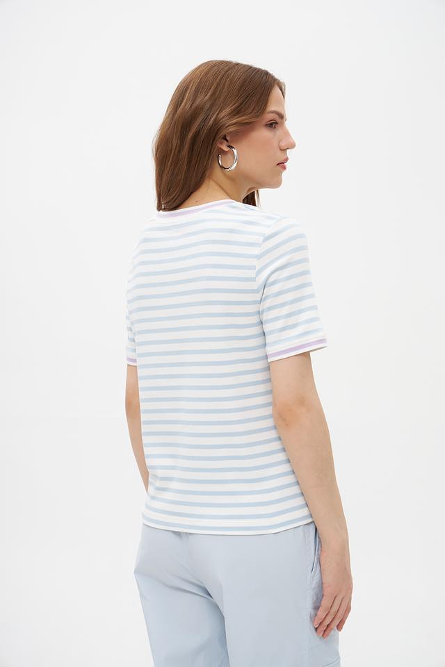 Женская футболка Marc Cain голубого цвета в полоску с коротким рукавом. Модель выполнена из хлопка с добавлением эластана, имеет круглый вырез горловины и небольшую вышивку на груди. Состав: хлопок 94%, эластан 6%