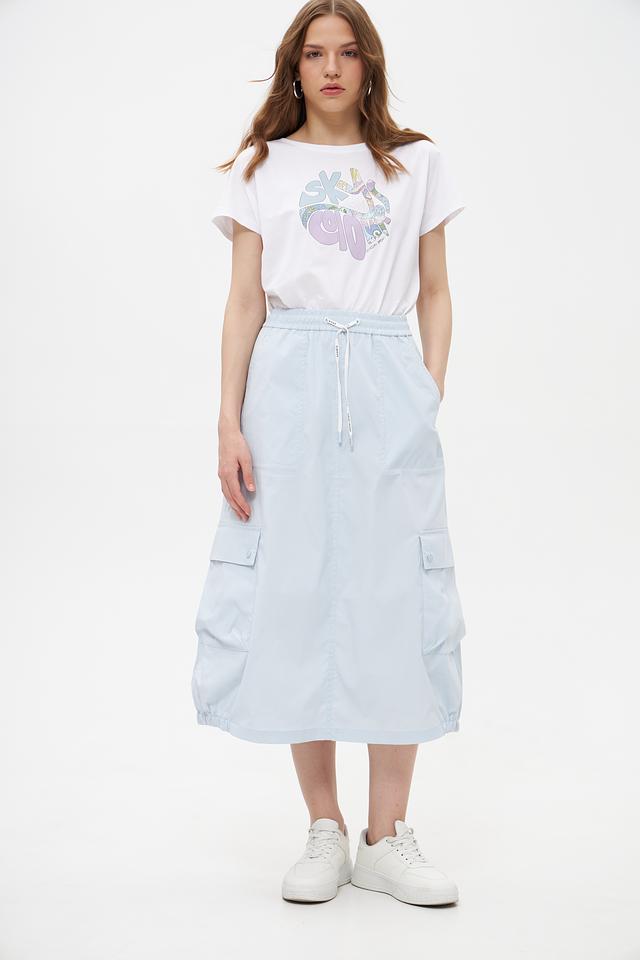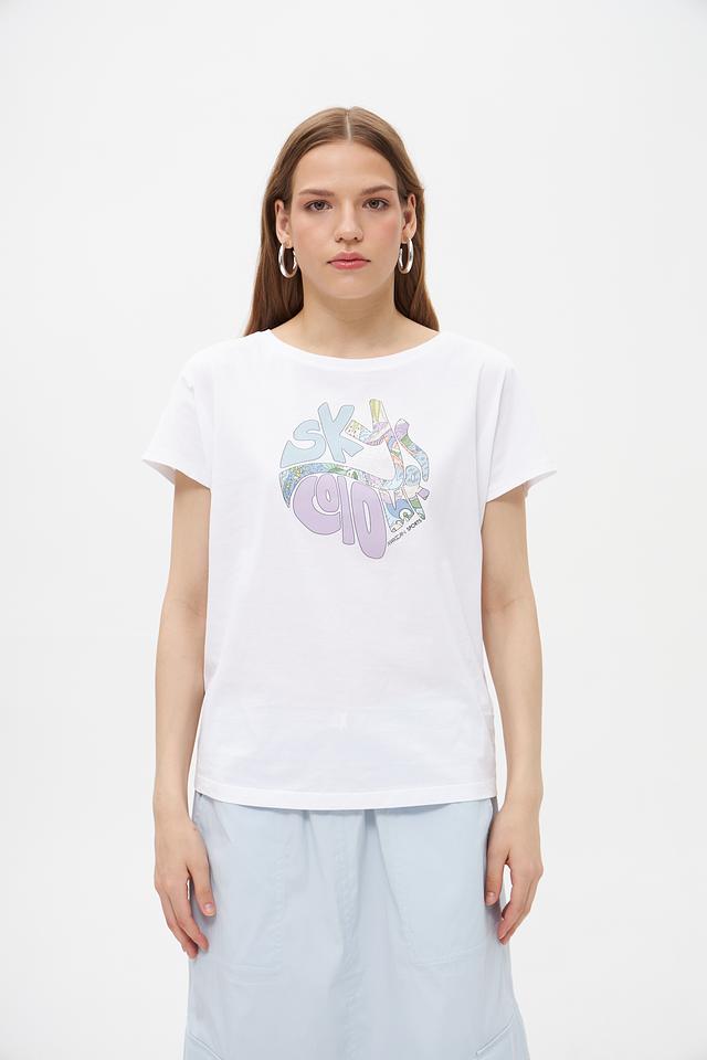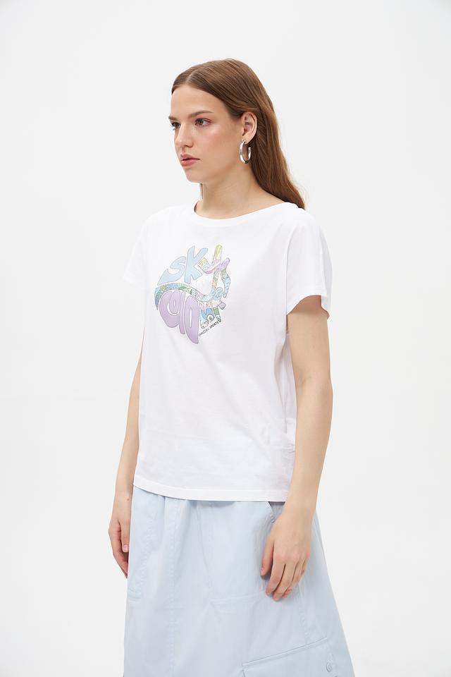 Футболка имеет свободный крой, обеспечивающий свободу движений. Декорирована ярким графическим принтом, который придаёт образу индивидуальность. Круглый вырез горловины и короткие рукава делают эту футболку идеальным выбором для теплой погоды.