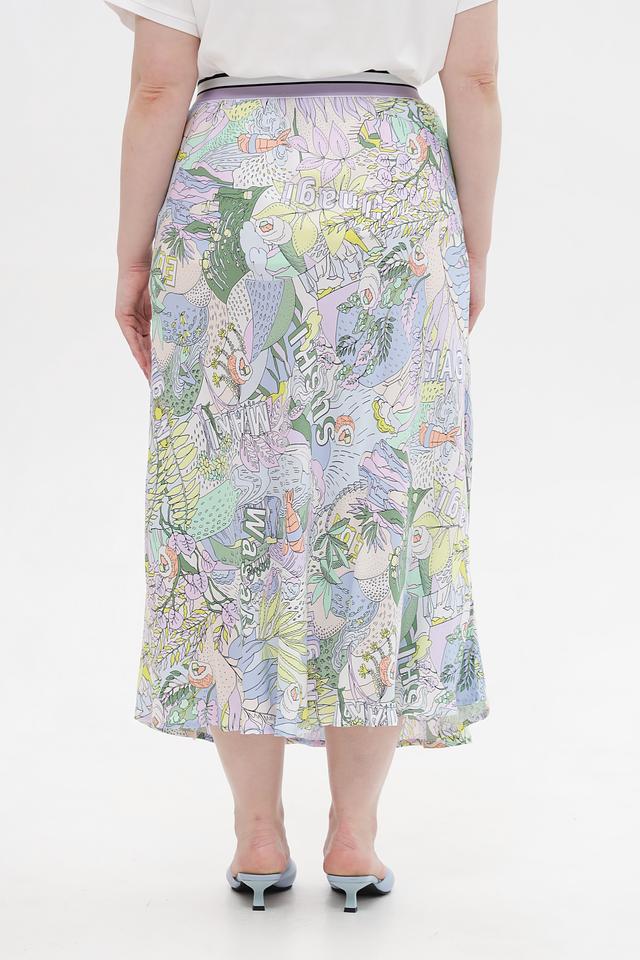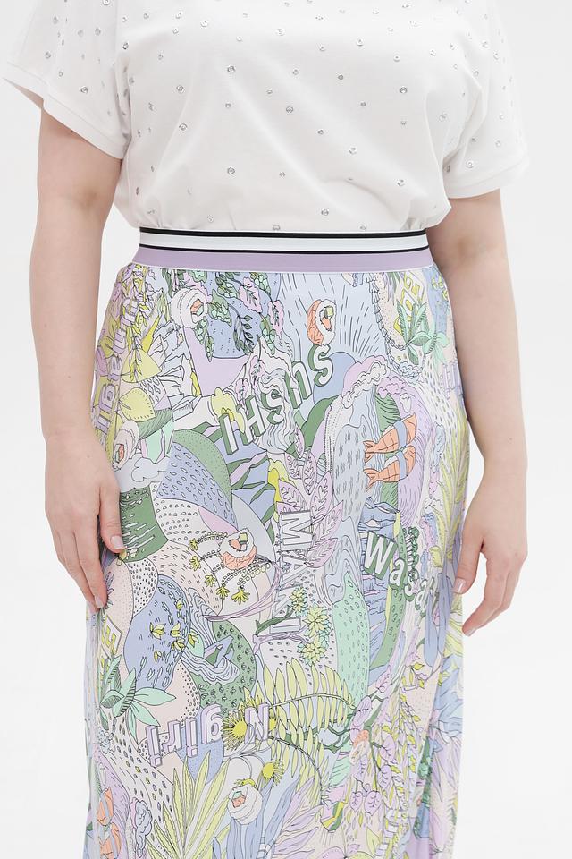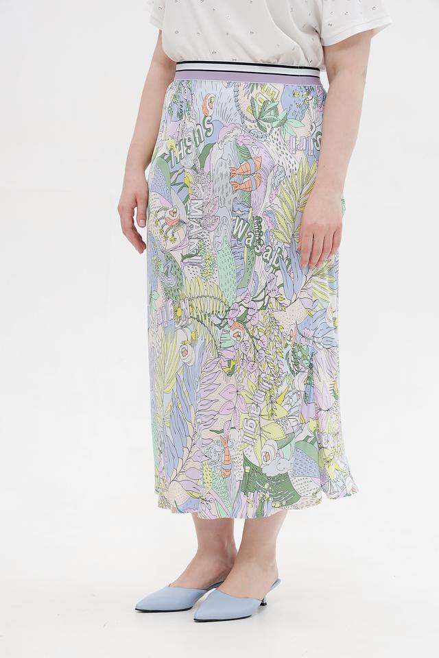 Основным акцентом юбки является яркий и оригинальный принт с изображением растительных мотивов и надписей. Эластичный пояс обеспечивает надежную посадку по фигуре, подчеркивая талию.