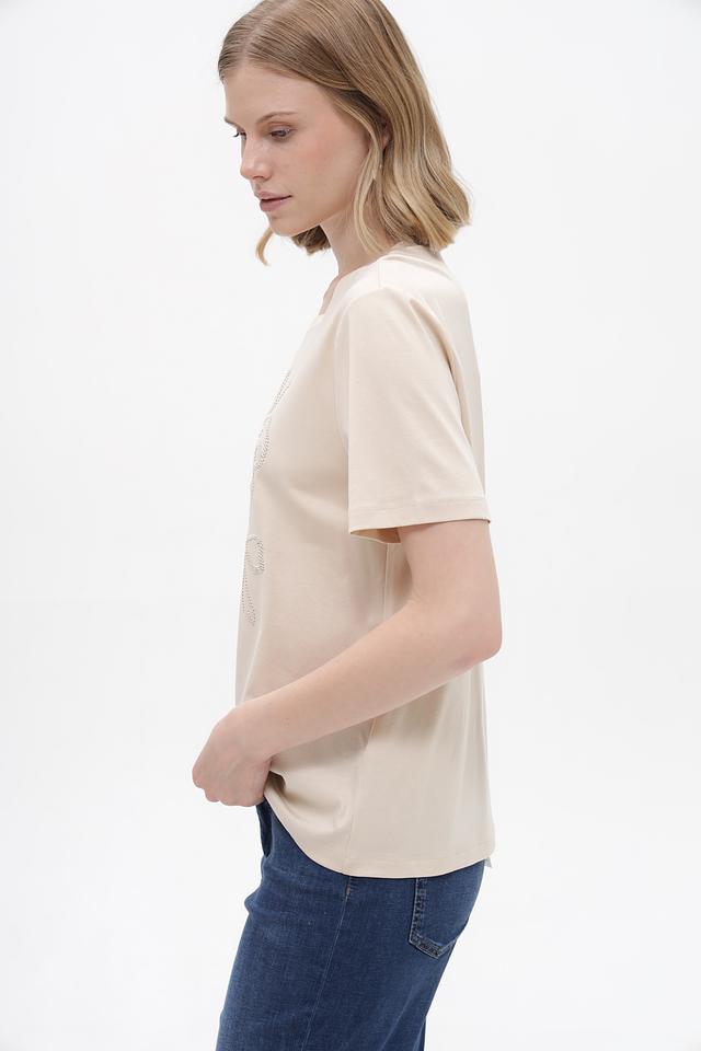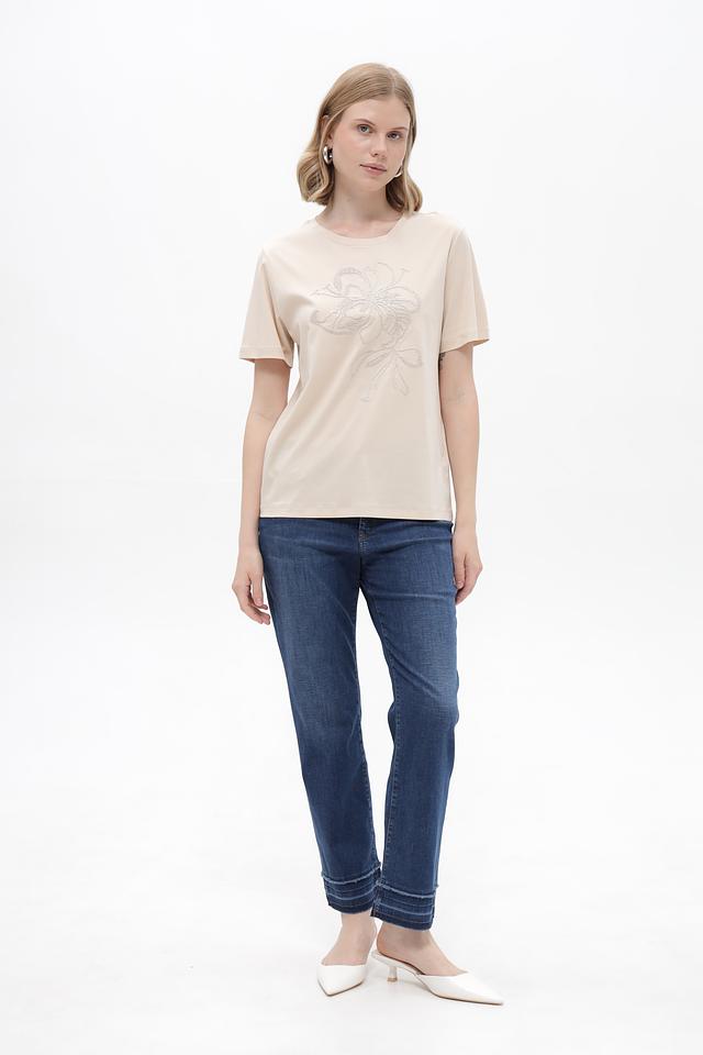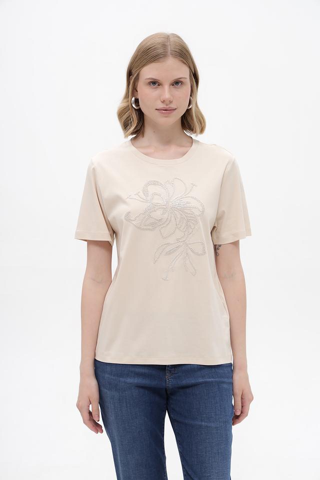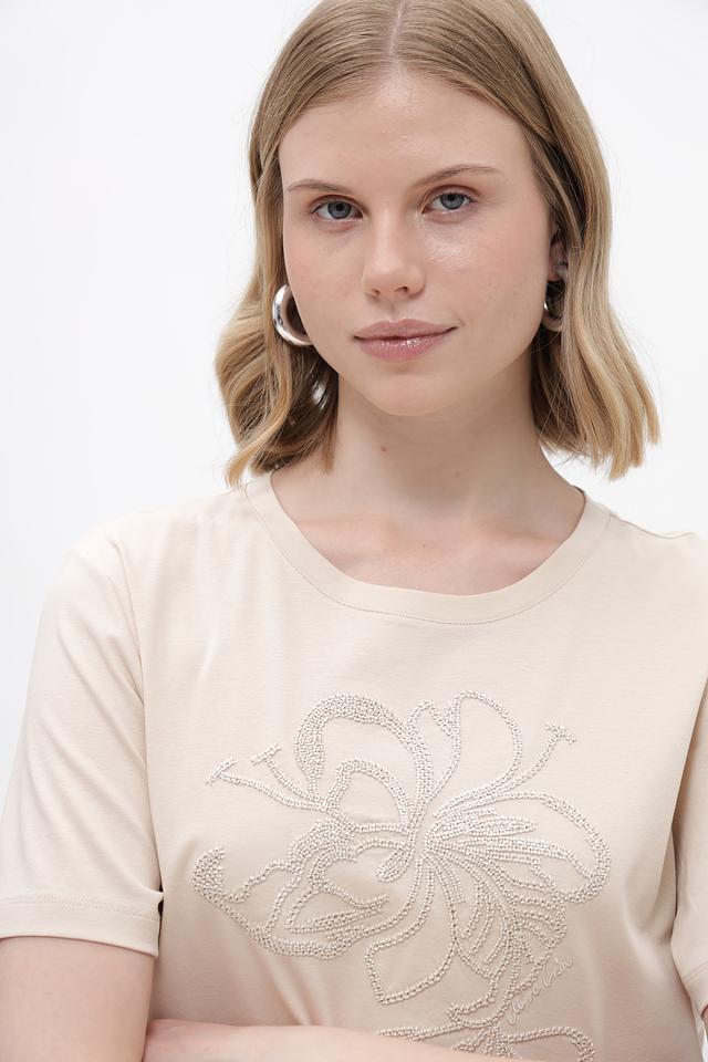 Женская футболка Marc Cain бежевого цвета, украшена вышивкой в виде цветка. Модель выполнена из 100% хлопка, обеспечивающего комфорт в носке. Состав: хлопок 100%