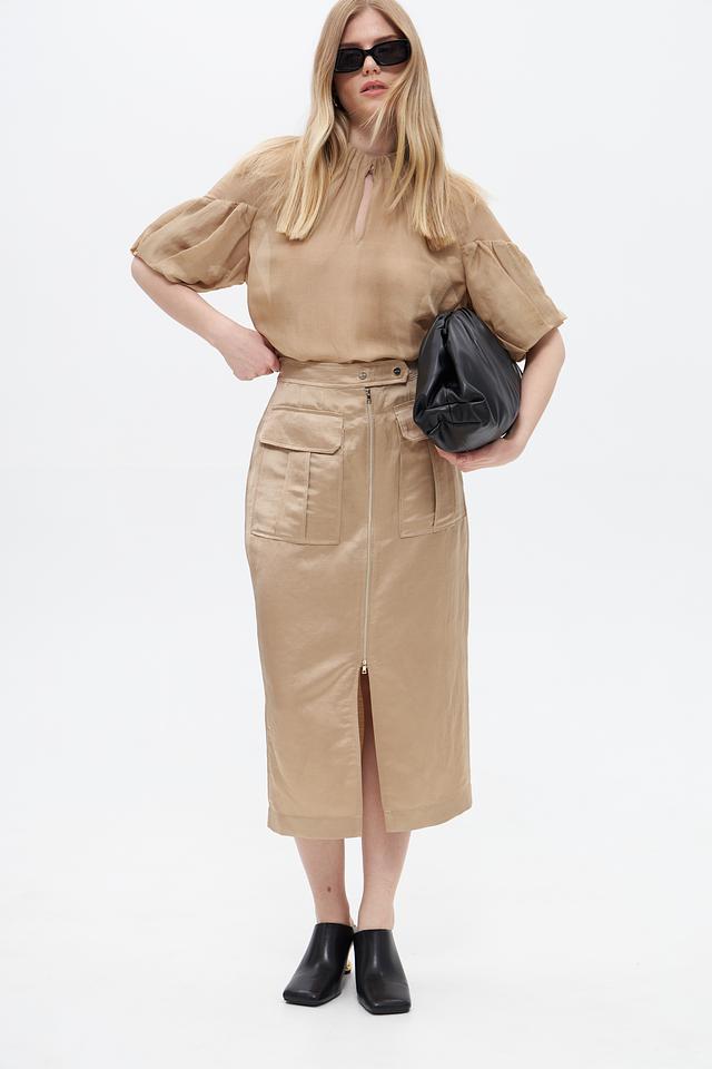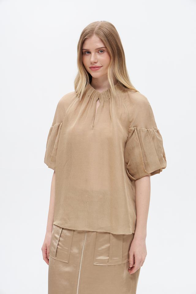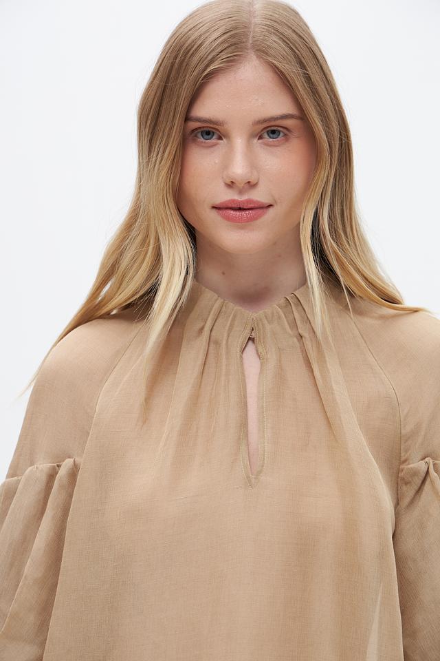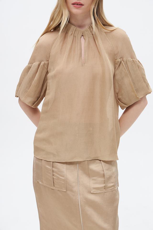 Бежевая блуза Marc Cain из льна и шёлка с рукавами-фонариками и вырезом-капелькой. Изделие выполнено из натуральных материалов, обеспечивающих комфорт и воздухопроницаемость. Состав: лен 55%, шелк 45%