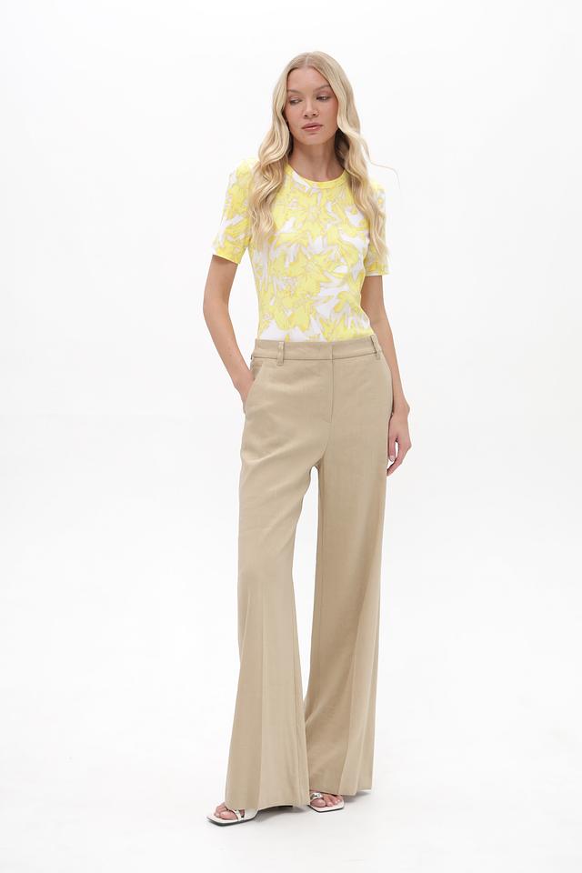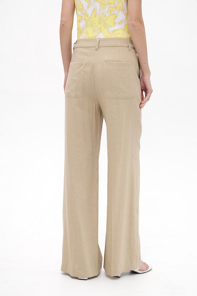 Модель выполнена из сочетания льна (62%) и вискозы (35%) с добавлением эластана (3%). Лен обеспечивает воздухопроницаемость и приятные тактильные ощущения, а вискоза придает ткани мягкость и драпируемость. Эластан обеспечивает небольшую эластичность для более комфортной посадки.