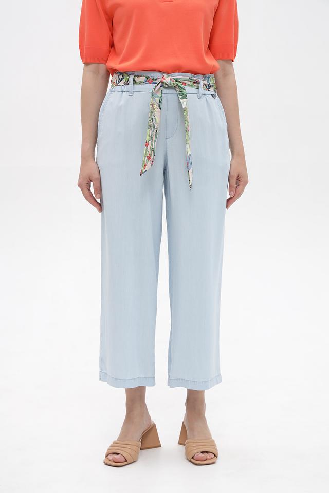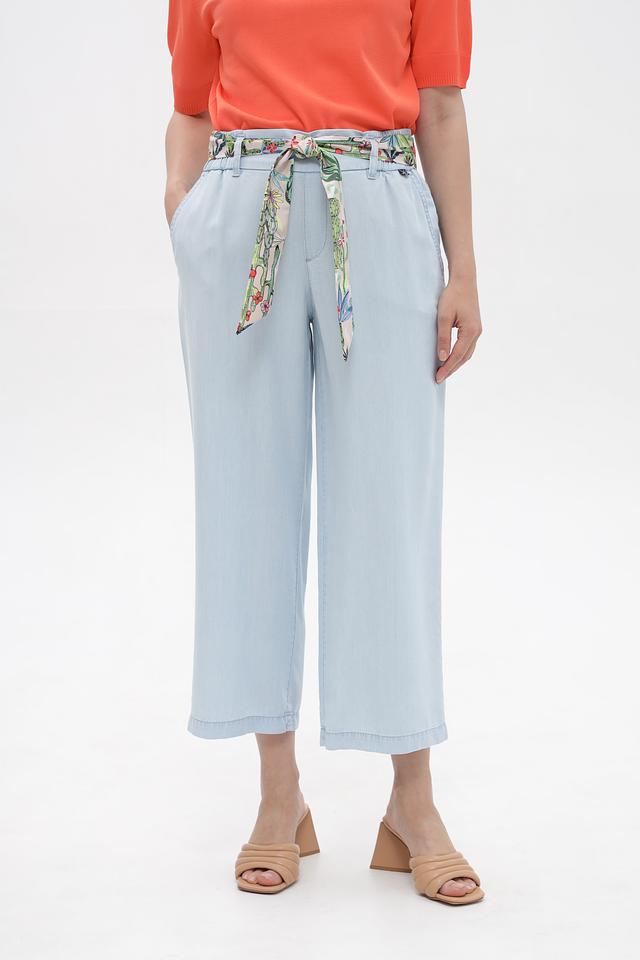Женские брюки-кюлоты Marc Cain голубого цвета, выполнены из 100% лиоцелла. Модель дополнена поясом с цветочным принтом и имеет удобный крой. Состав: лиоцел 100%