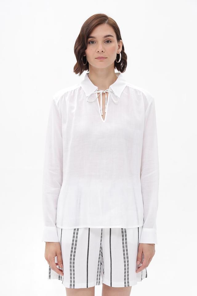 Блузка имеет классический воротник и длинные рукава с манжетами на пуговицах. Передняя часть украшена декоративными завязками на горловине, которые позволяют регулировать глубину выреза и создавать различные образы.