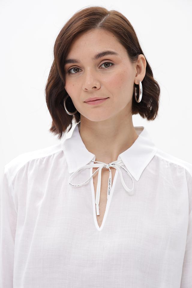 Белая блузка Marc Cain из 100% рами. Легкая, воздушная модель с завязками на горловине и длинными рукавами. Идеальный выбор для создания элегантного образа. Состав: рами 100%