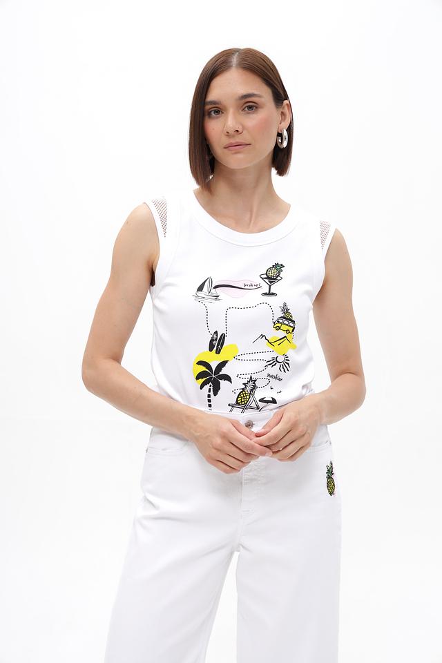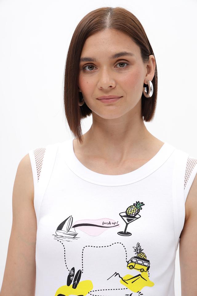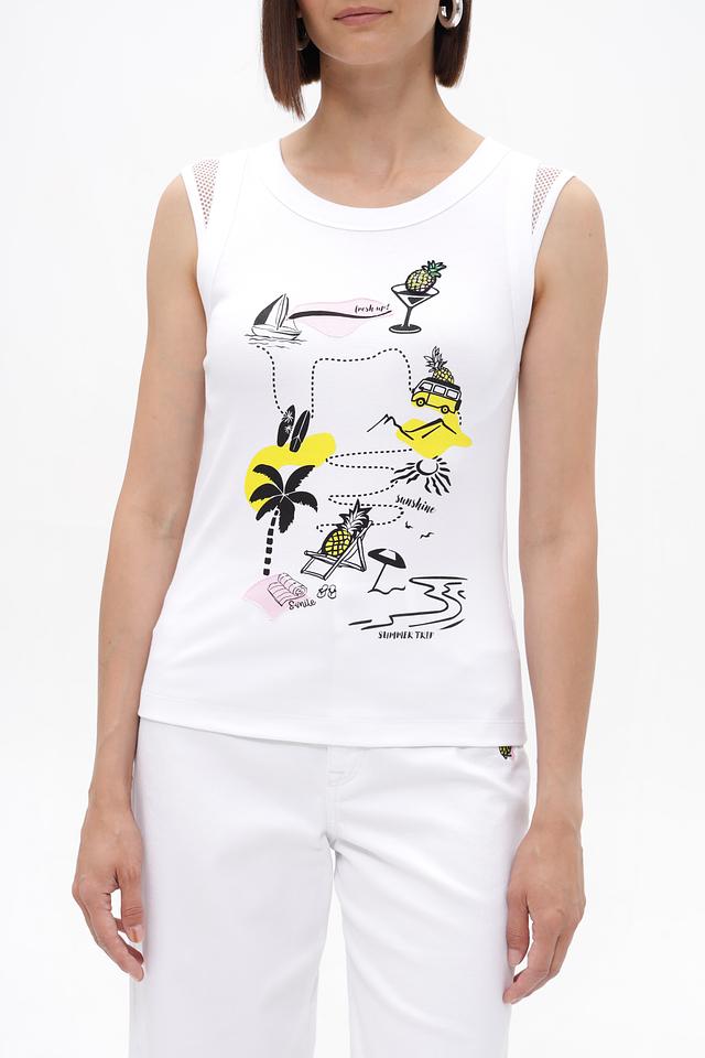 Белый летний топ Marc Cain из хлопка с ярким тропическим принтом. Модель выполнена из мягкого трикотажа с добавлением эластана для комфортной посадки. Идеальный выбор для создания лёгкого и стильного образа. Состав: хлопок 94%, эластан 6%