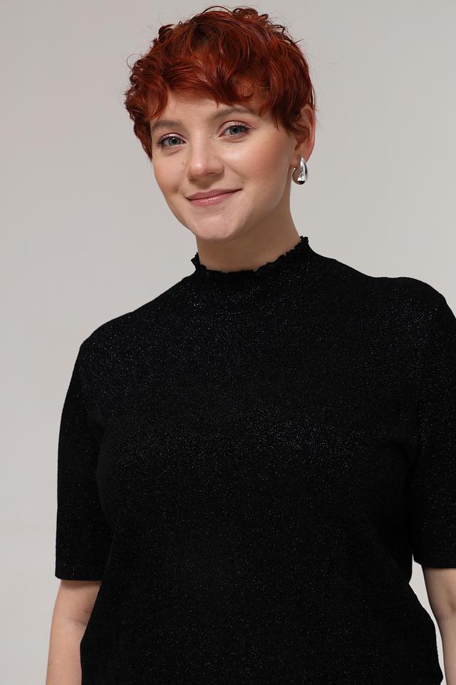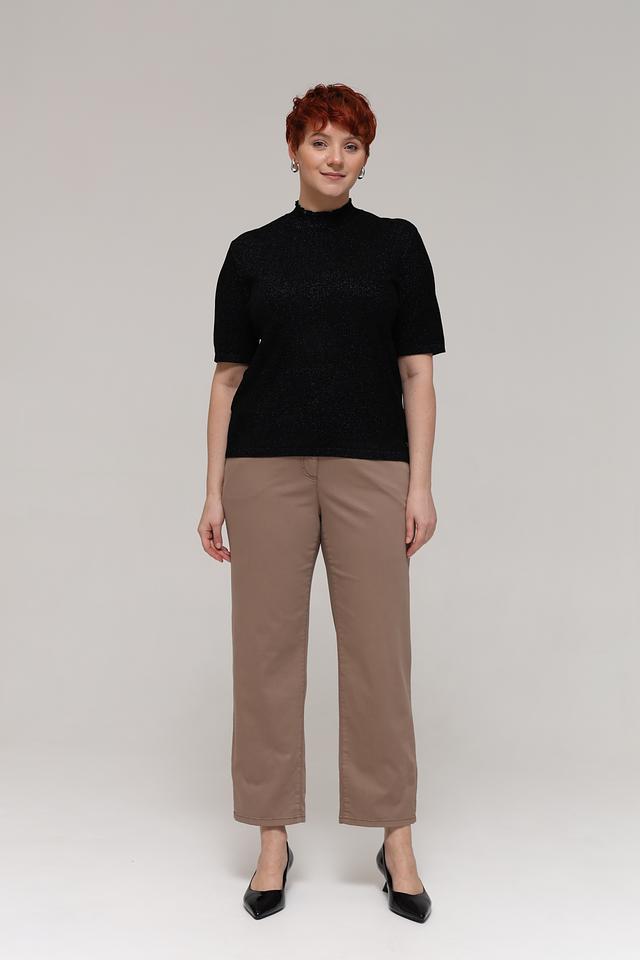 Модель имеет короткие рукава и высокий воротник-стойку, что делает её универсальной и подходящей для различных случаев. Пуловер отлично сочетается с брюками, юбками и джинсами, позволяя создавать разнообразные стильные образы.