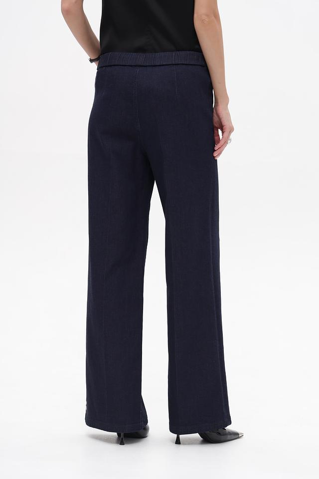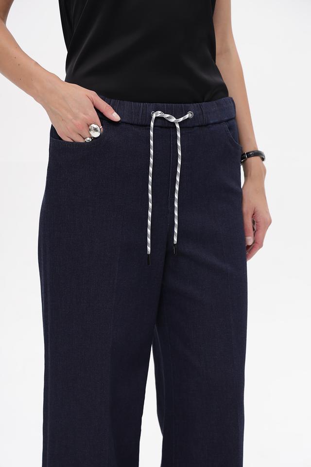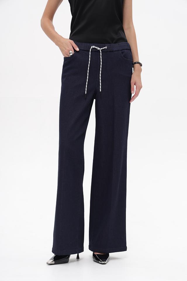 Джинсы с завышенной талией визуально удлиняют ноги и подчеркивают фигуру. Удобный пояс на кулиске позволяет регулировать посадку по талии, а также создает акцентный элемент в дизайне.