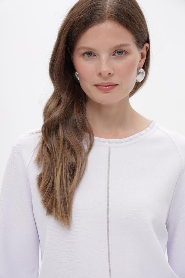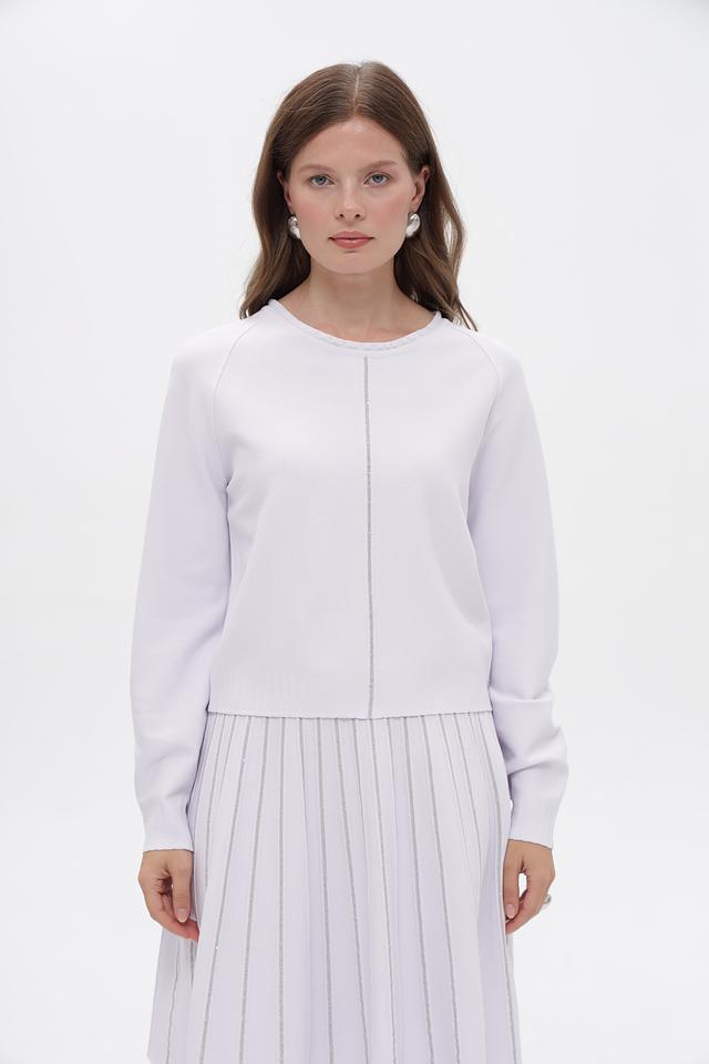 Изящный пуловер от Marc Cain, выполненный в нежном светло-лиловом оттенке. Модель имеет прямой силуэт, длинные рукава и круглый вырез горловины. Вертикальная декоративная строчка подчеркивает линию фигуры и придает изделию элегантный вид.