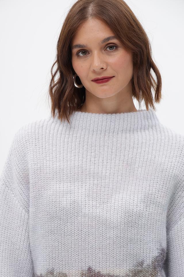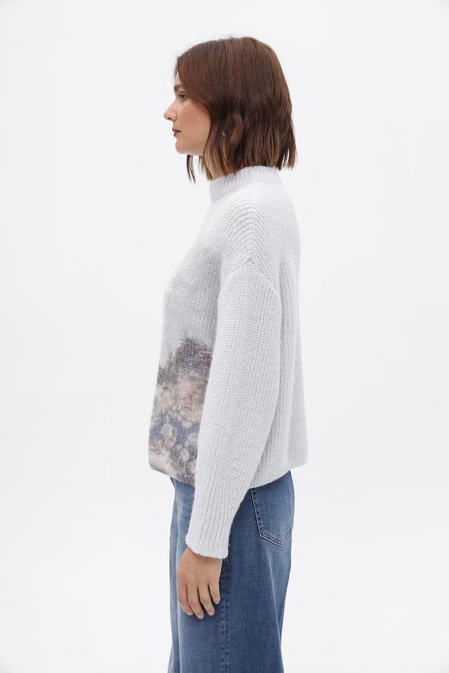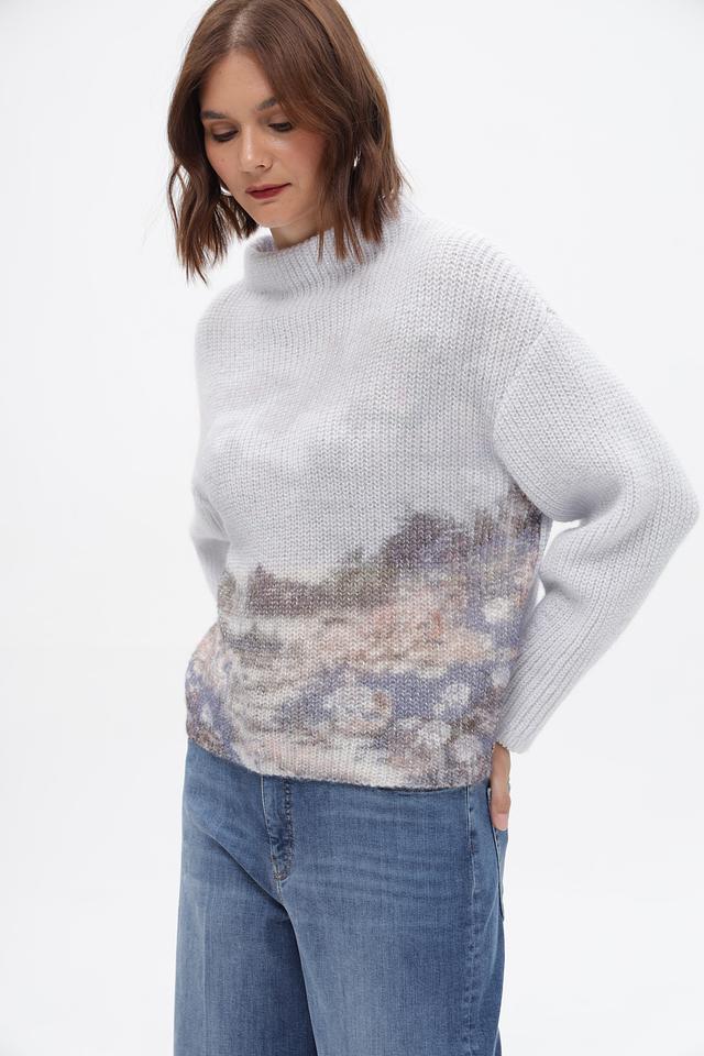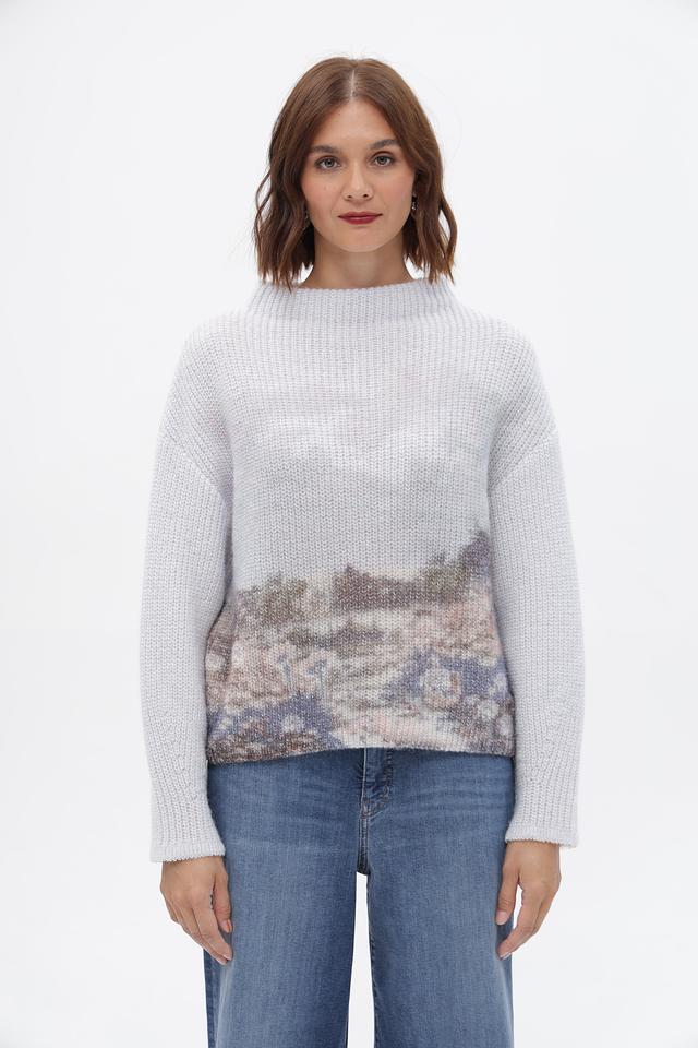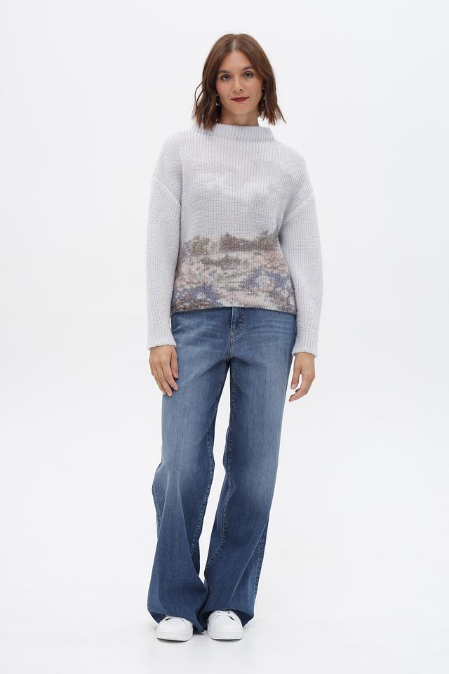 Представляем серый пуловер от Marc Cain, выполненный в свободном крое. Модель имеет высокий воротник и украшена оригинальным принтом, изображающим горный пейзаж.