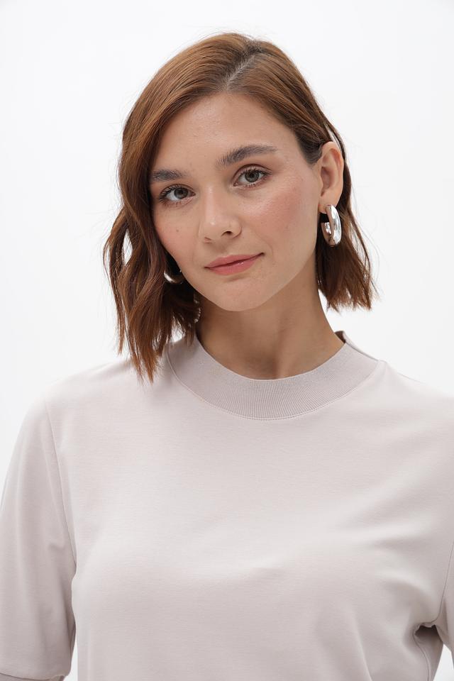 Футболка с короткими рукавами и округлым вырезом горловины. Вырез горловины декорирован тонкой тесьмой серебристого цвета, что придает модели изысканность.