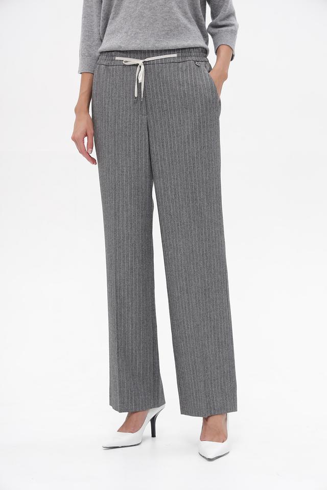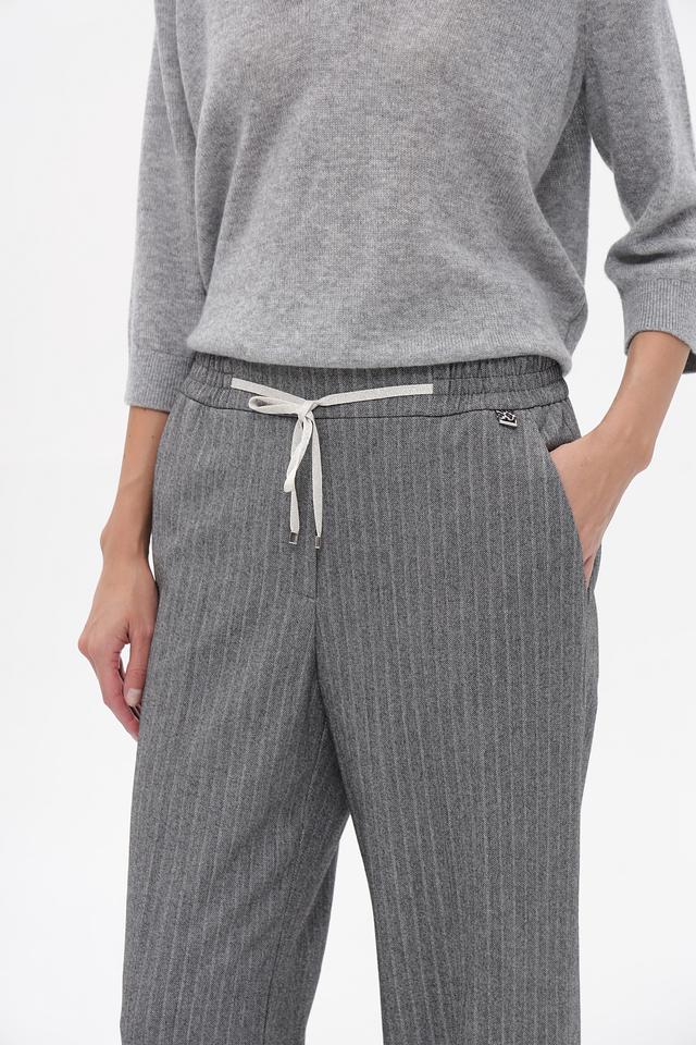 Представляем элегантные брюки от бренда Marc Cain. Модель выполнена в сером цвете с тонкой вертикальной полоской, что визуально вытягивает силуэт.