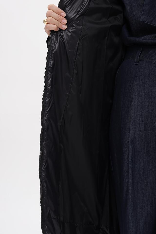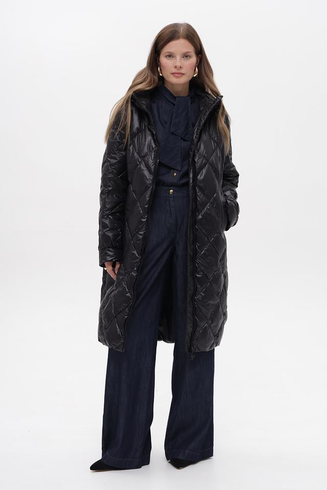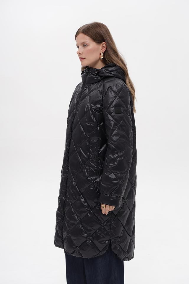 Черное стеганое пальто Marc Cain из 100% полиамида — стильное и практичное решение для прохладной погоды. Модель с капюшоном и удобными карманами. Состав: полиамид 100%