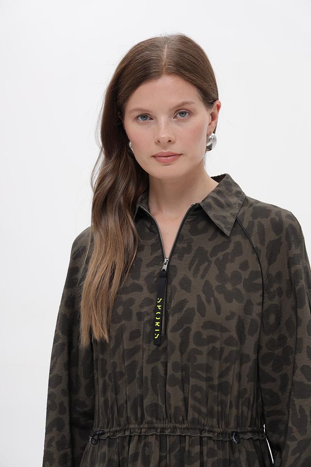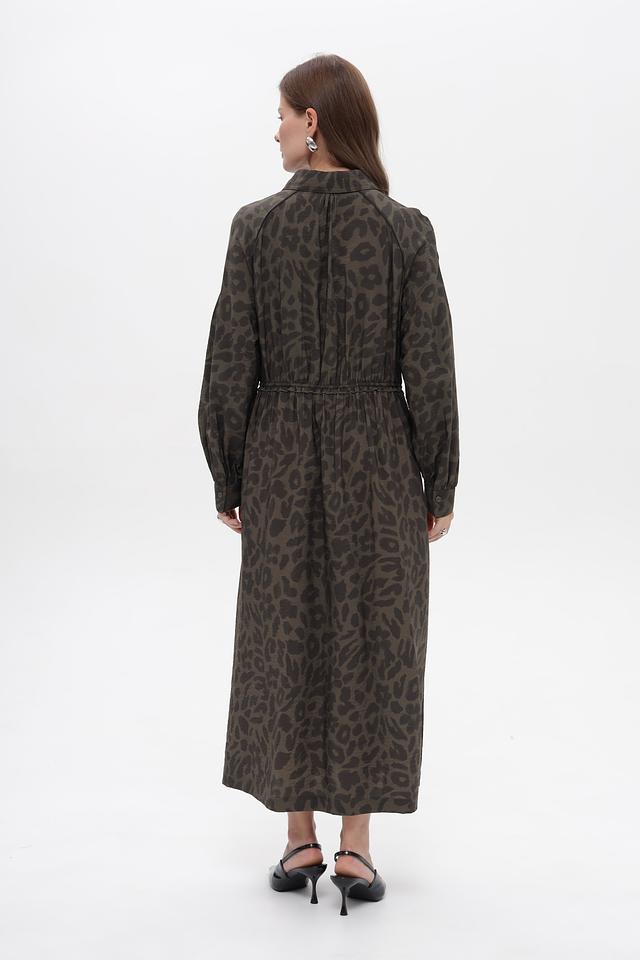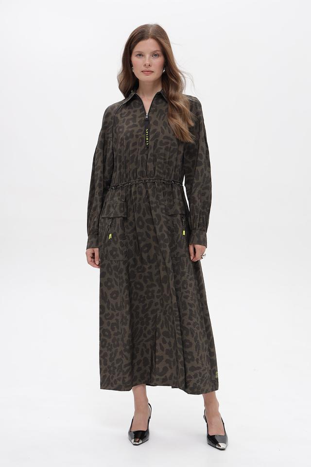 Платье Marc Cain Sports цвета хаки с леопардовым принтом – стильное и комфортное решение для повседневного образа. Модель выполнена из вискозы с добавлением полиамида, имеет воротник рубашечного типа и застежку-молнию. Состав: вискоза 85%, полиамид 15%
