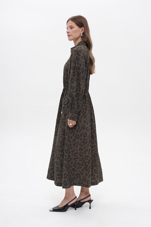 Платье имеет прямой крой, воротник рубашечного типа и застежку-молнию. Длинные рукава с манжетами и пояс с кулиской подчеркивают талию и создают женственный силуэт. Боковые карманы добавляют практичности.