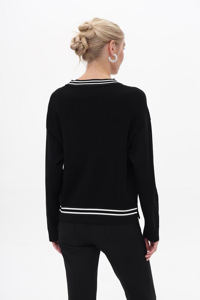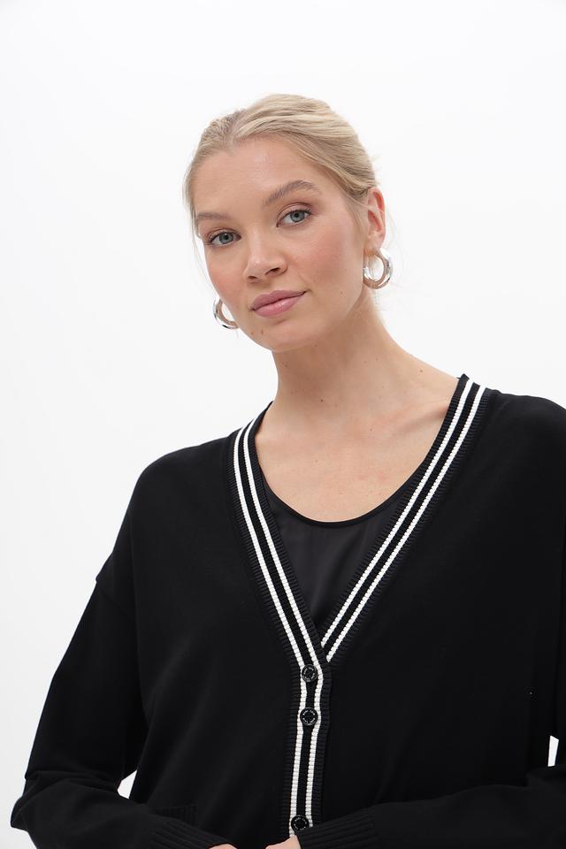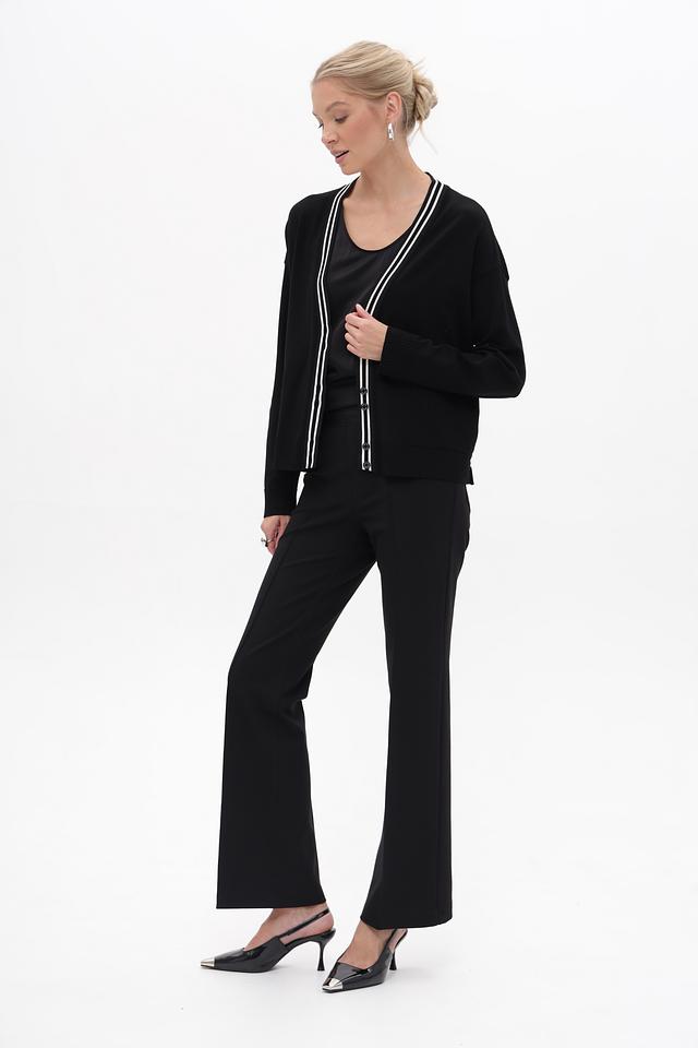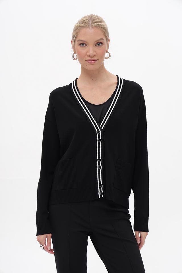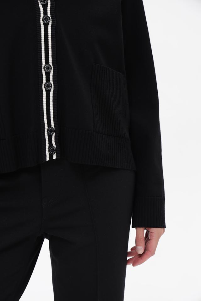 Модель имеет V-образный вырез, который визуально удлиняет шею, и застёжку на пуговицы. Контрастная белая отделка по краю выреза, планке и манжетам добавляет жакету выразительности. Боковые карманы обеспечивают практичность.