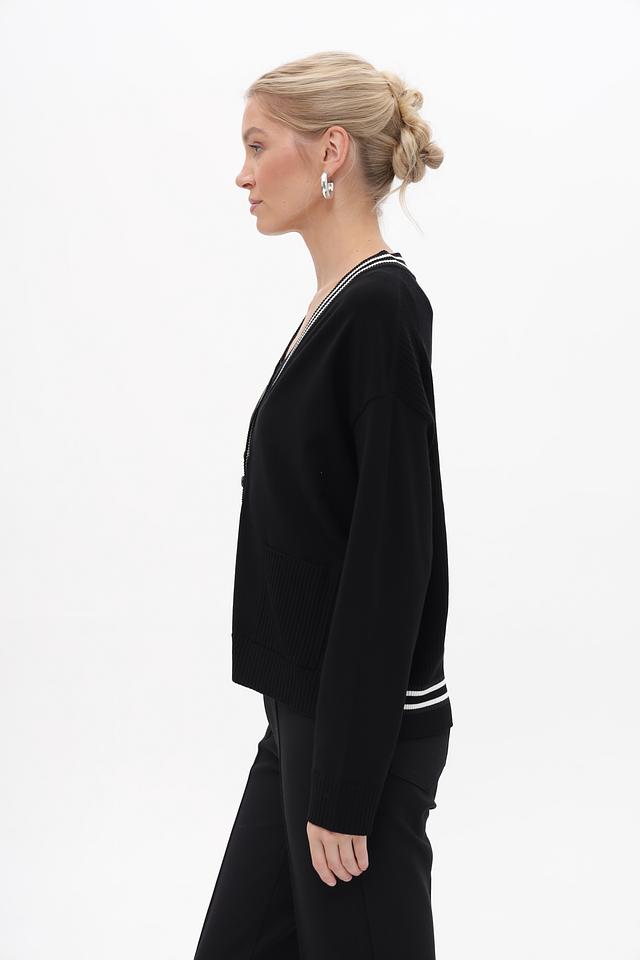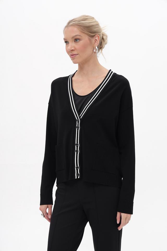 Чёрный жакет от Marc Cain с V-образным вырезом и контрастной отделкой. Изготовлен из вискозы с добавлением полиэстера для комфорта и долговечности. Идеально дополнит ваш повседневный гардероб. Состав: вискоза 70%, полиэстер 30%