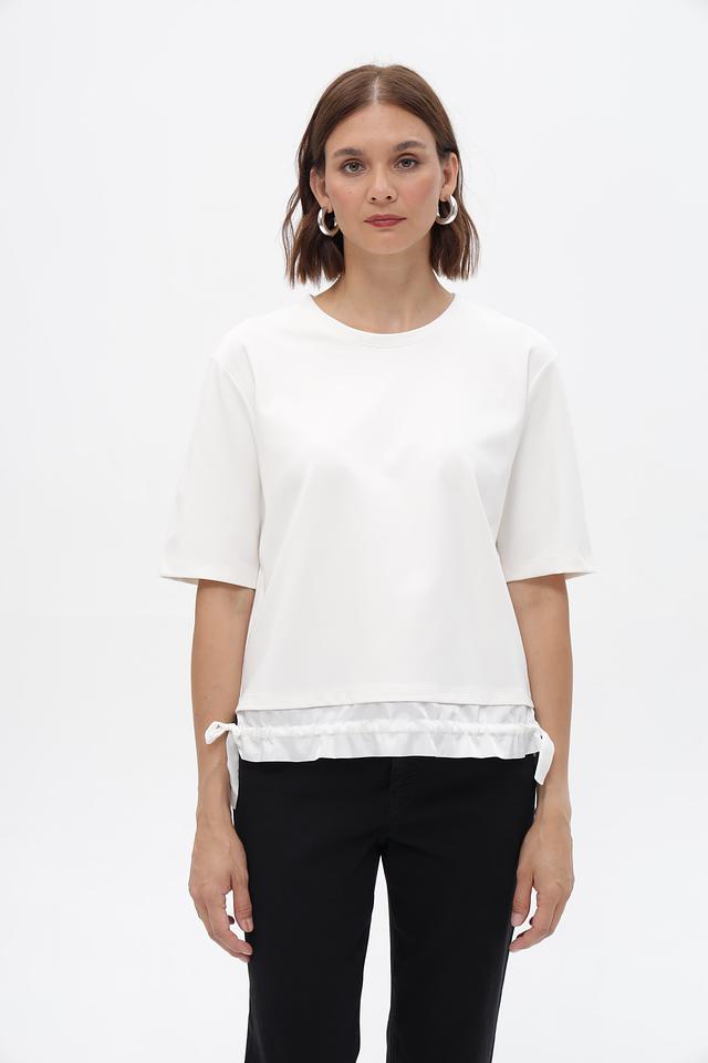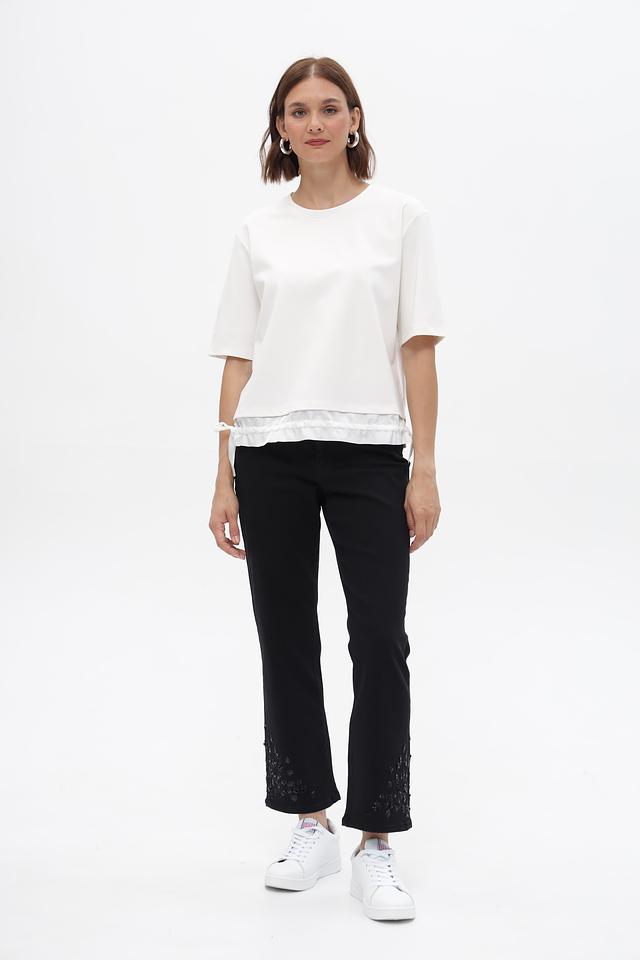 Модель имеет короткие рукава и свободный крой, обеспечивающий комфорт при ношении. Особый акцент сделан на декоративные оборки по нижнему краю, которые придают изделию женственность и изысканность.
