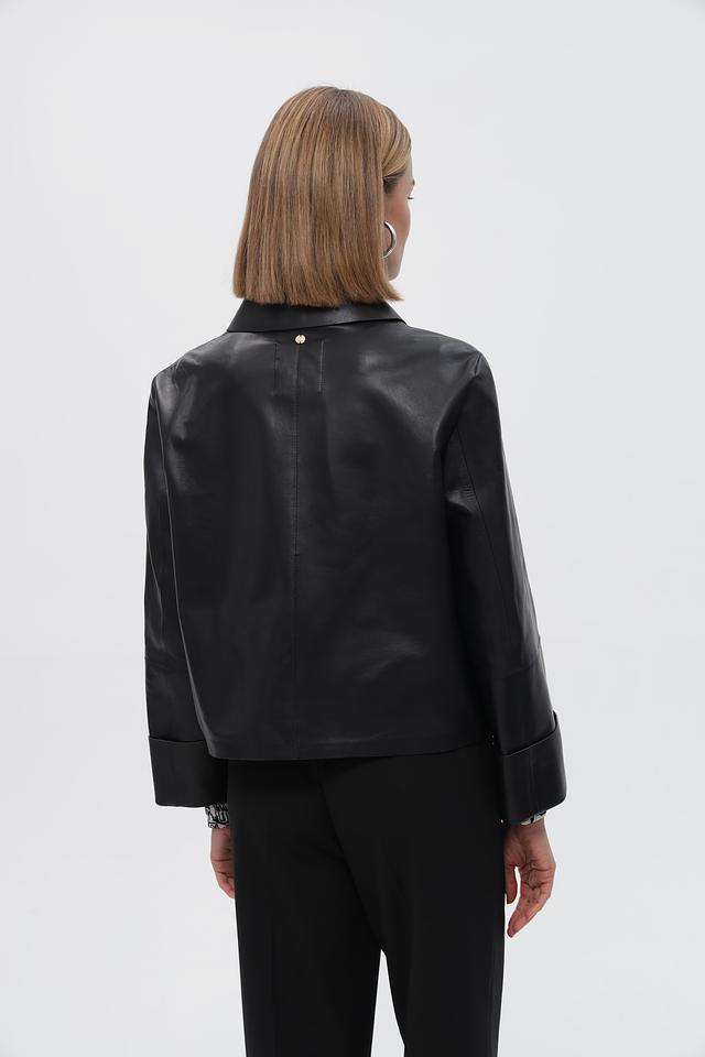 Чёрный кожаный жакет от Marc Cain – стильный и лаконичный выбор для создания актуальных образов. Модель выполнена из 100% натуральной кожи и застегивается на пуговицы. Состав: кожа 100%