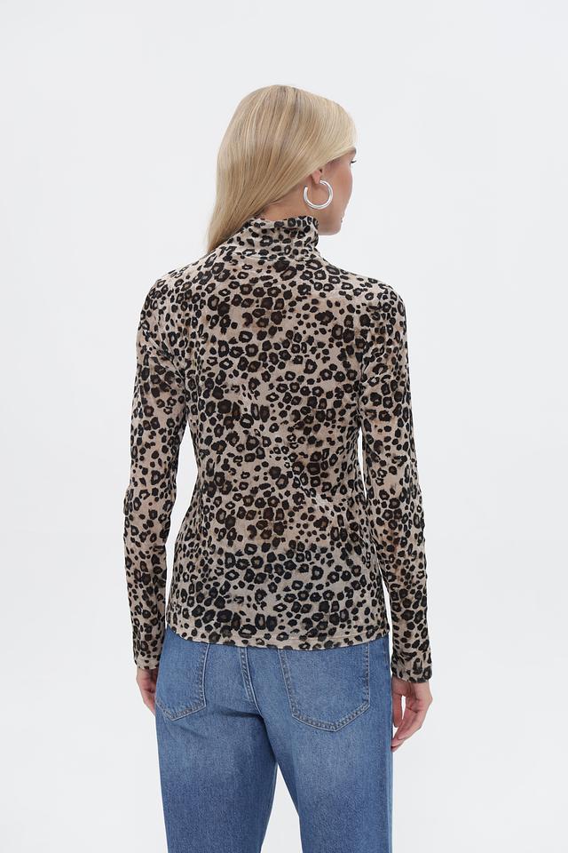 Футболка имеет облегающий силуэт, длинные рукава и высокий воротник-водолазку. Главная особенность модели – эффектный леопардовый принт, который добавляет образу динамичности и выразительности.