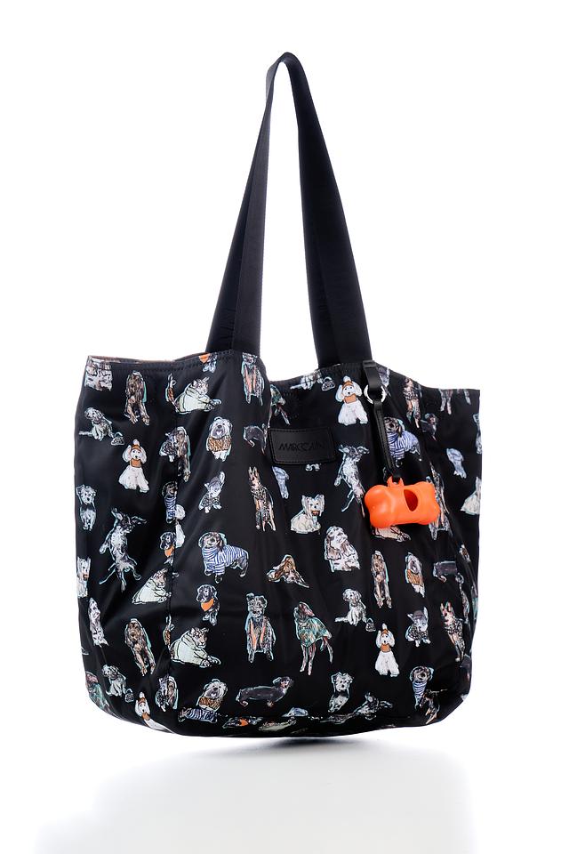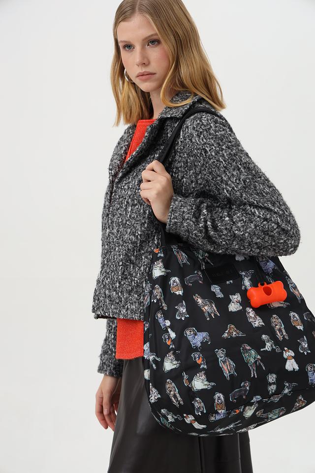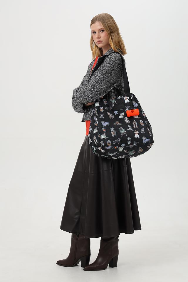 Основной цвет сумки – чёрный, а ярким акцентом служит оригинальный принт с изображением различных пород собак.