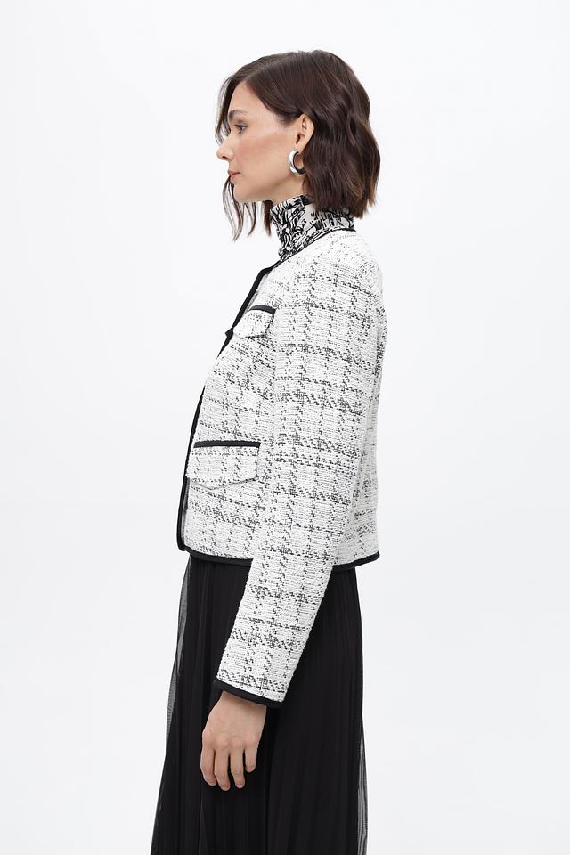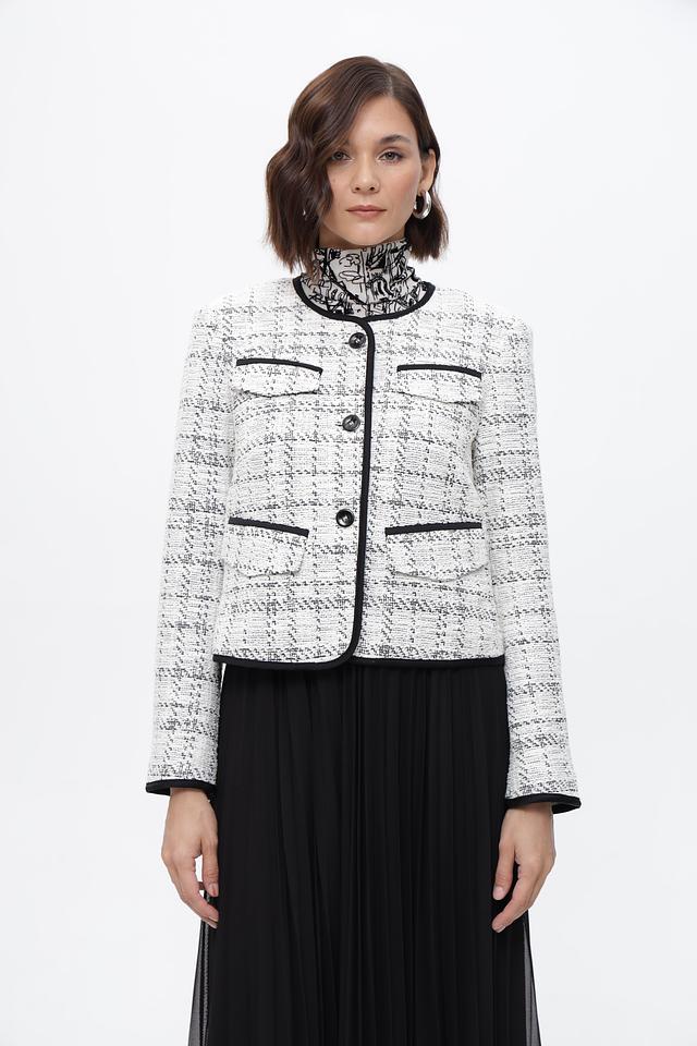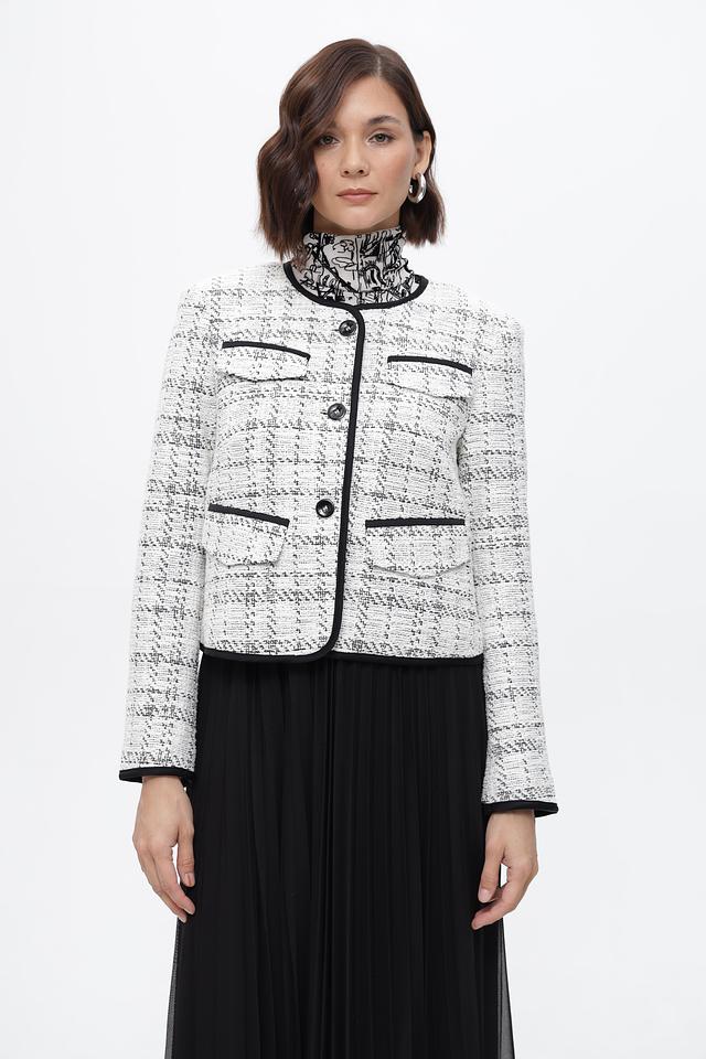 Классический жакет от Marc Cain Collections станет прекрасным выбором для создания элегантного образа. Модель выполнена в белом цвете с характерным рисунком в клетку.