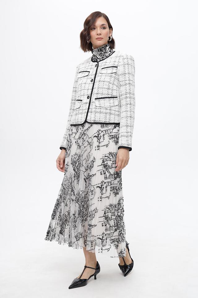 Эта стильная юбка от Marc Cain станет ярким акцентом вашего образа. Модель выполнена в белом цвете и украшена оригинальным принтом, изображающим городской пейзаж, выполненным в чёрном цвете.