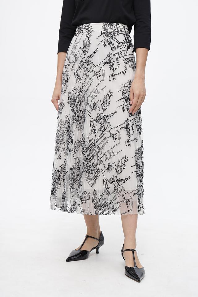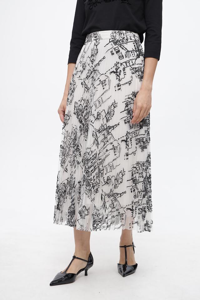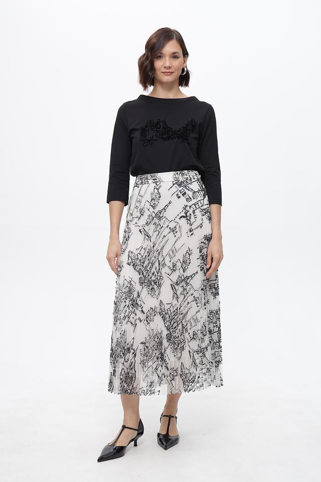Юбка Marc Cain белого цвета с оригинальным принтом в виде городского пейзажа. Изготовлена из 100% полиэстера, модель имеет плиссированную фактуру и длину миди. Состав: полиэстер 100%