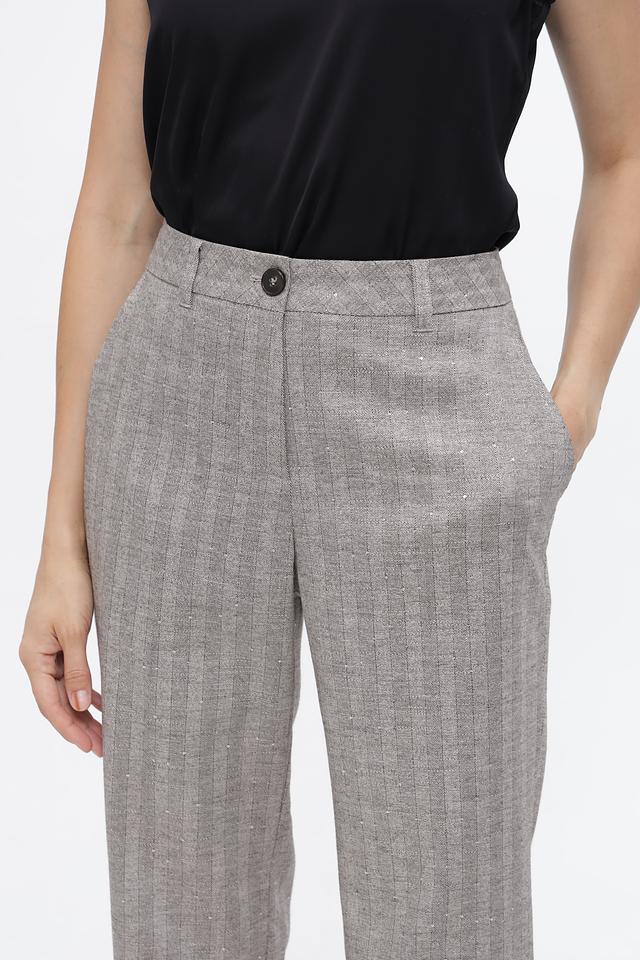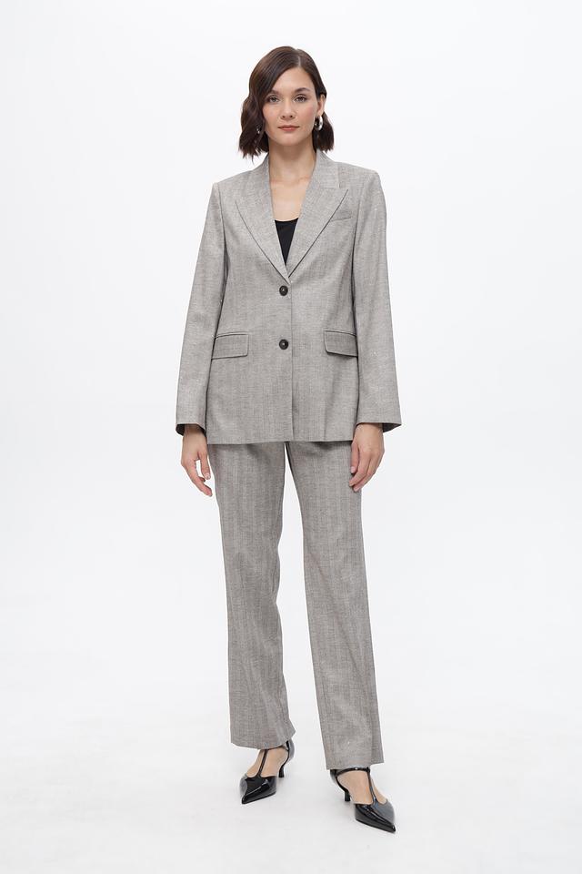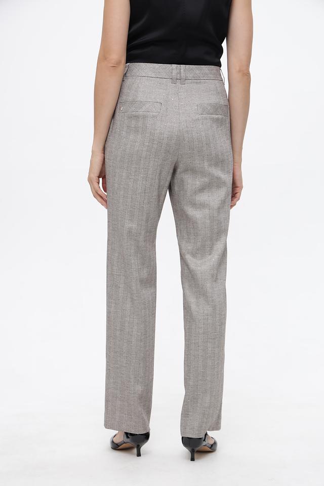 Брюки имеют высокую посадку, прямой крой и стандартную длину. Спереди расположены боковые карманы, а сзади — два кармана с клапанами.