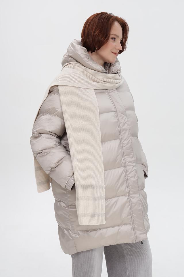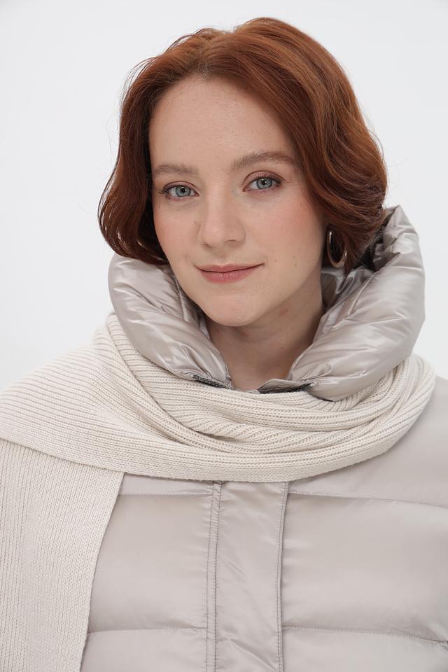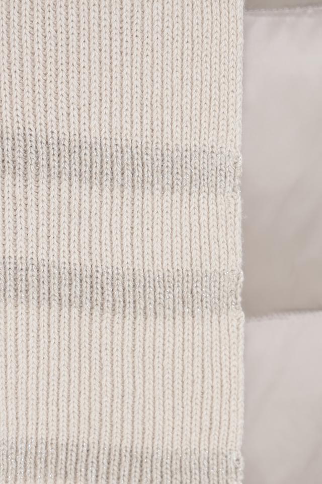 Шарф выполнен в бежевом цвете, с классической полосатой текстурой. Он изготовлен из высококачественной смеси материалов: шерсти, кашемира, вискозы и полиамида с добавлением метализированной нити, что придает изделию деликатный блеск.