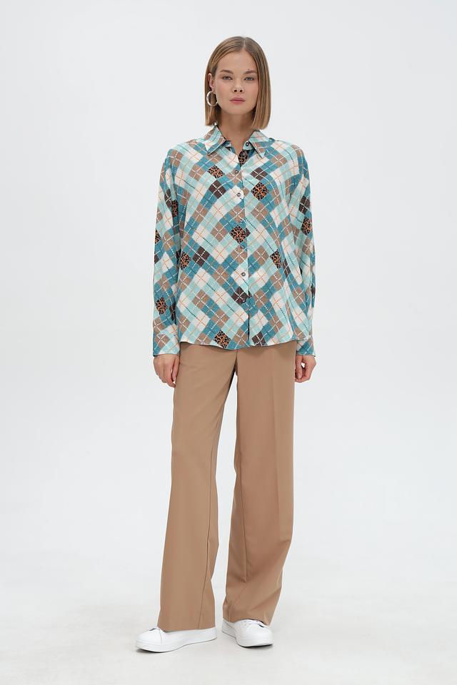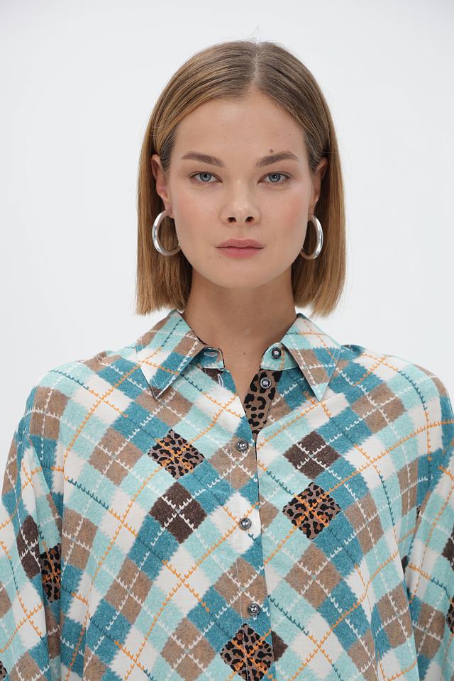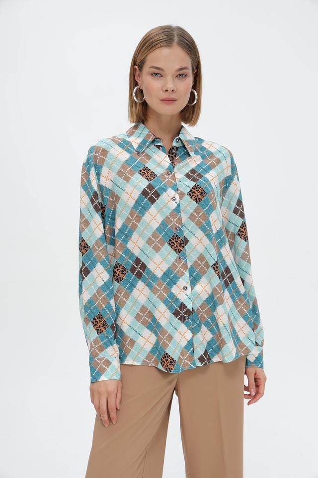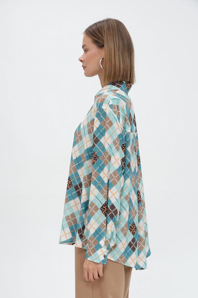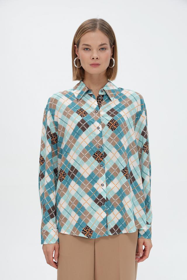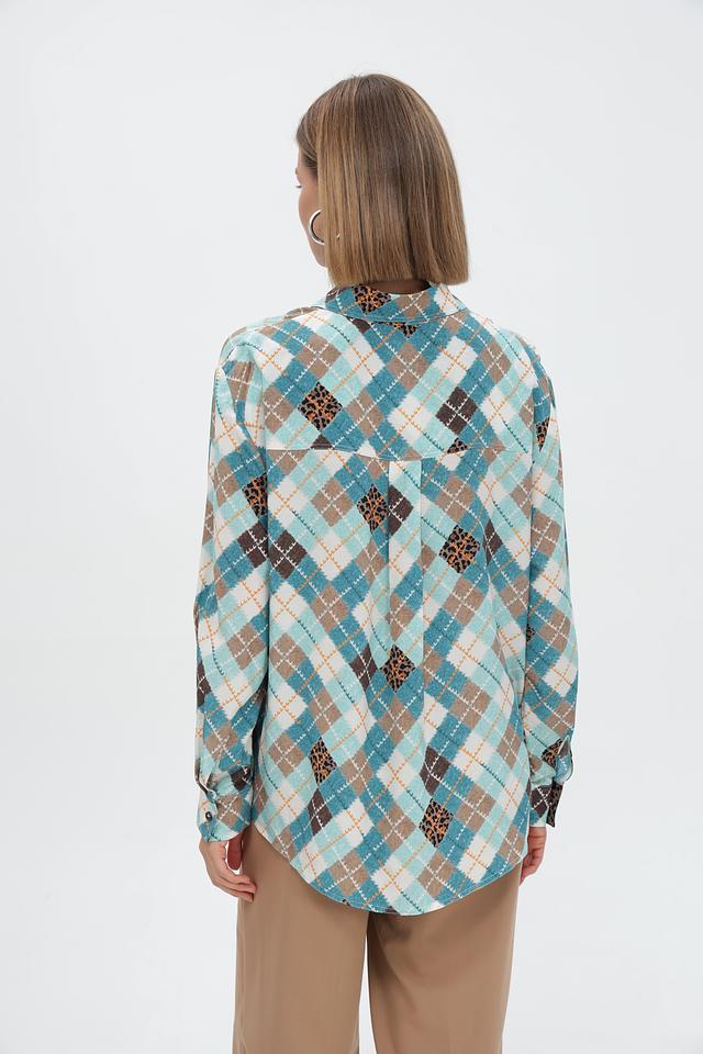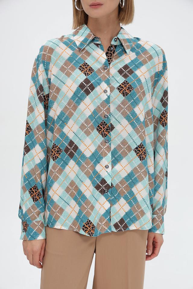 Стильная рубашка Marc Cain голубого цвета с оригинальным принтом в виде сочетания клетчатого узора и леопардового мотива. Изготовлена из 100% вискозы для комфорта и лёгкости. Состав: вискоза 100%