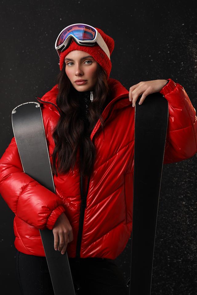 Эластичные манжеты и резинка по низу куртки обеспечивают плотное прилегание, сохраняя тепло. Куртка оснащена боковыми карманами на молнии для хранения необходимых мелочей. Глянцевая текстура ткани придает изделию особый шарм и элегантность.