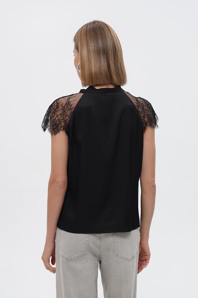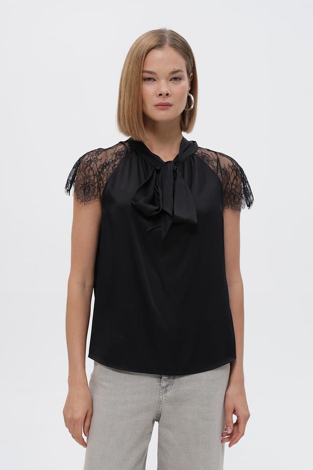 Особенностью блузки является её отделка: кружевные рукава придают образу романтичность и лёгкость, а декоративный бант на горловине добавляет элегантности.