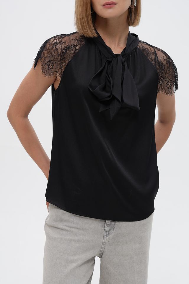 Чёрная блузка Marc Cain с бантом на горловине и кружевными рукавами станет элегантным дополнением к вашему гардеробу. Изготовлена из гладкой ткани с изящной отделкой. Состав: шелк 92%, эластан 8%