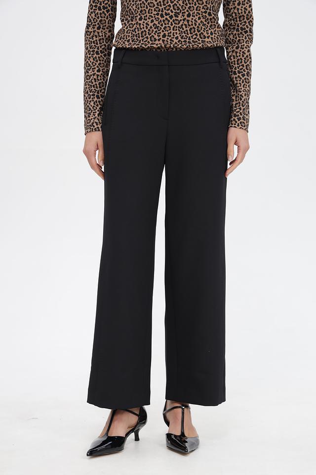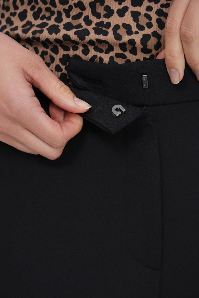 Модель имеет высокую посадку, которая визуально удлиняет ноги и подчеркивает талию. Брюки оснащены поясом на застежке и молнии, а также боковыми карманами для удобства.