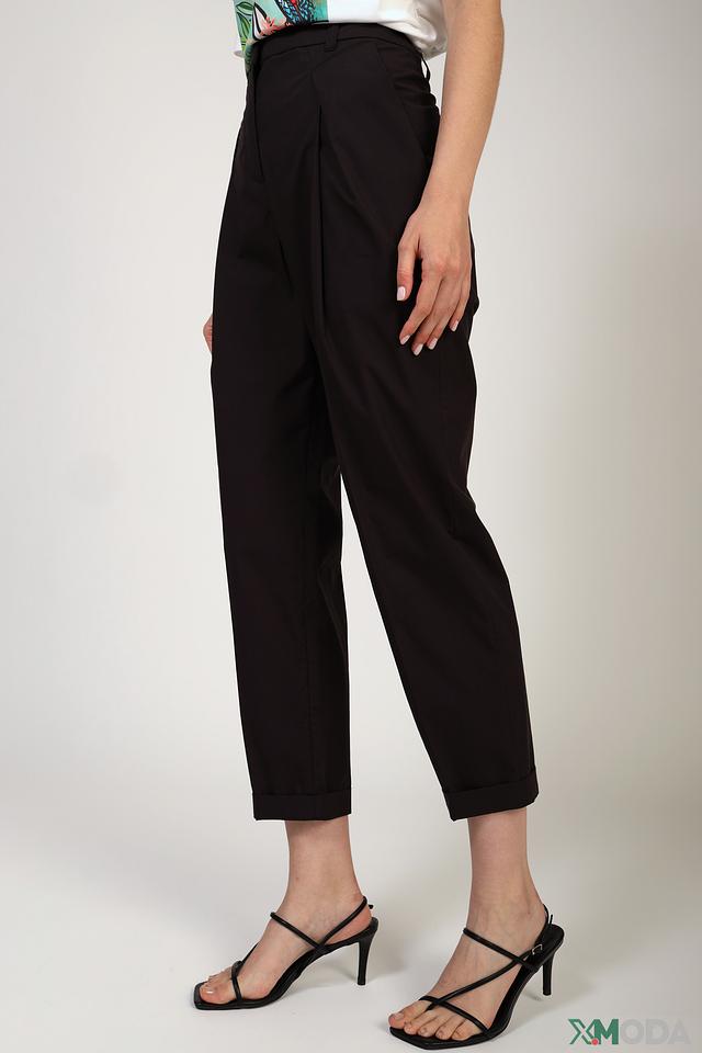 Брюки имеют прямую посадку, высокую талию и широкие штанины, слегка зауженные к низу. На передней части брюк расположены аккуратные складки, придающие им более изысканный вид. Застежка выполнена на молнию и пуговицу.