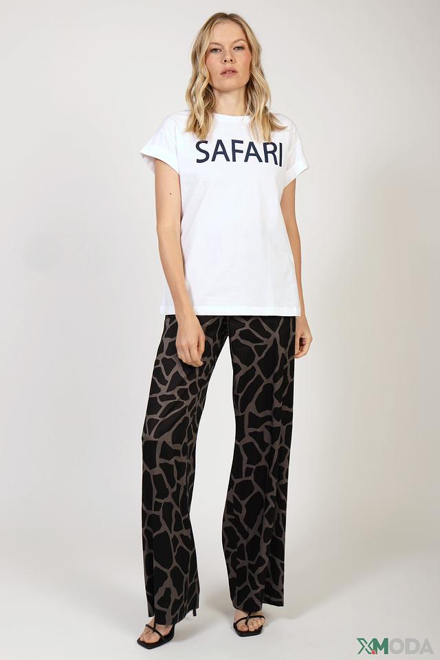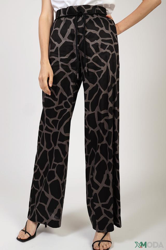 Женские брюки Marc Cain чёрно-серого цвета с оригинальным принтом под леопарда. Модель выполнена из лёгкой ткани с добавлением льна и вискозы, обеспечивающей комфорт и воздухопроницаемость. Брюки имеют удобный пояс на резинке со шнурком. Состав: лен 67%, вискоза 30%, эластан 3%