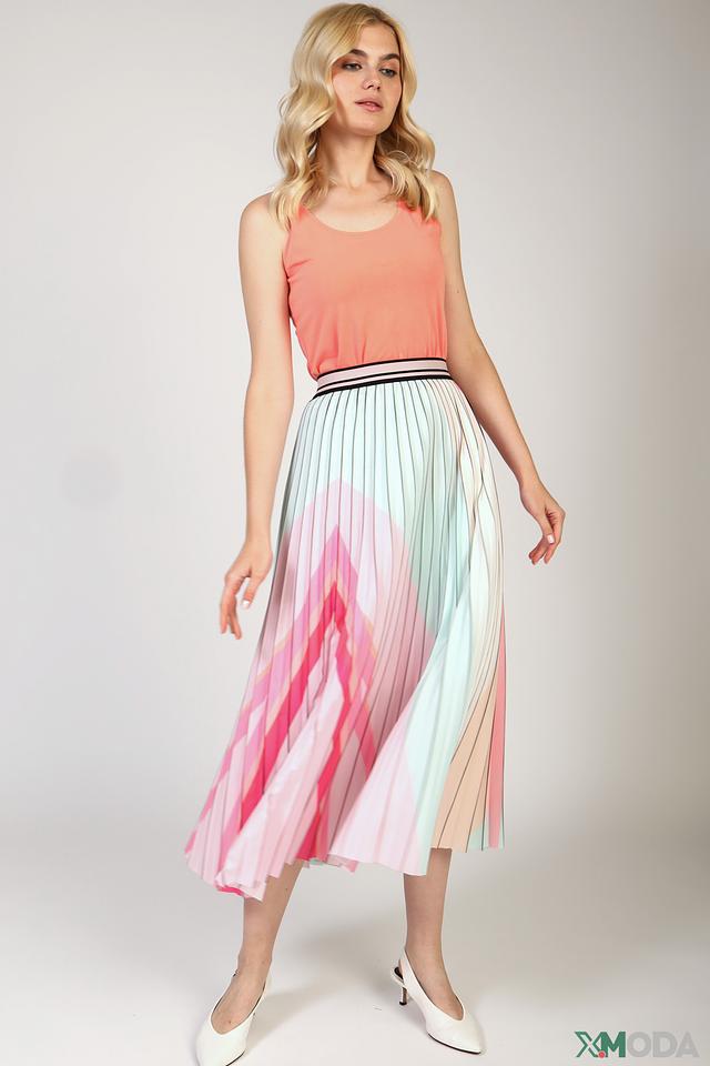 Юбка имеет плиссированную структуру и яркий, многоцветный принт, сочетающий в себе оттенки розового, голубого, персикового и белого. Широкий пояс с контрастной полоской добавляет акцент и подчеркивает талию.