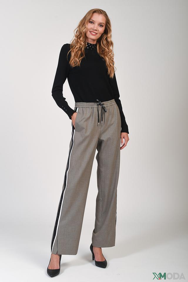 Брюки имеют прямой крой и классическую посадку на талии с эластичным поясом и шнурком для регулировки. Отличительной особенностью модели является контрастная полоса по боковой части штанин, выполненная в белом и черном цветах, что придает брюкам спортивный шик.