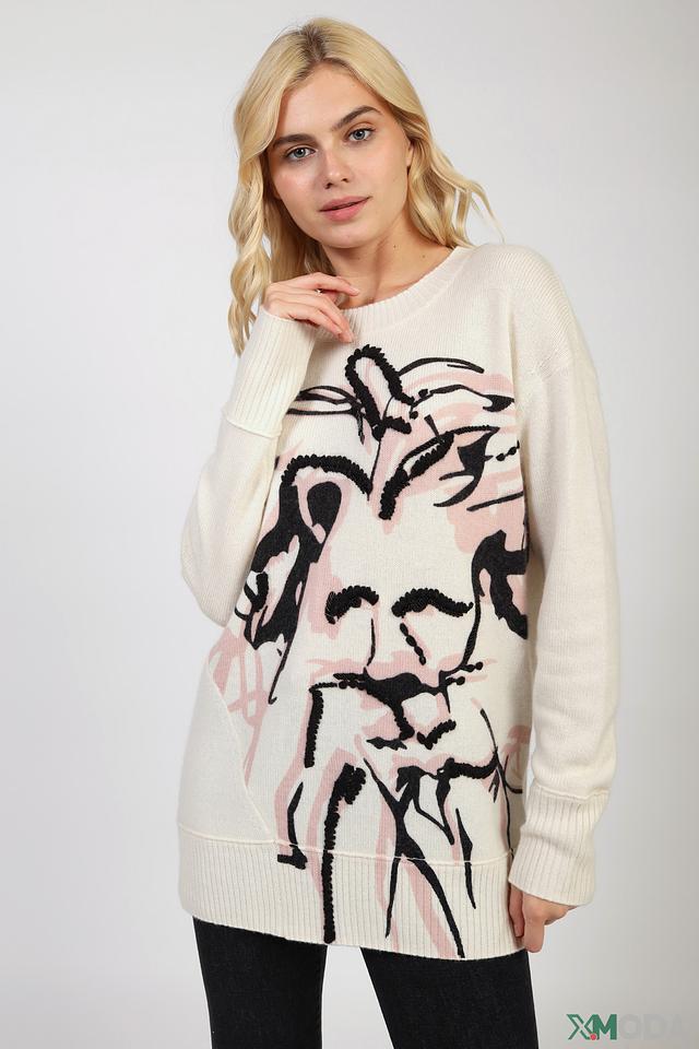 Принт выполнен в виде абстрактного портрета, сочетающего в себе черные, розовые и белые оттенки. Этот необычный рисунок придает пуловеру индивидуальность и делает его запоминающимся. Вырез горловины – округлый, классический. Пуловер идеально сочетается с джинсами, брюками или юбками, создавая разнообразные стильные образы.