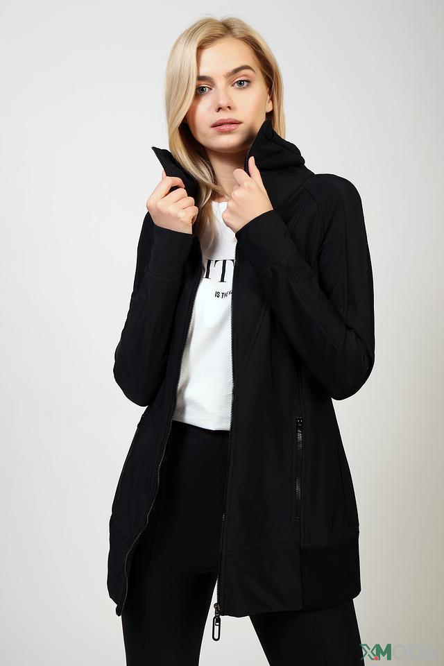 Модель имеет высокий воротник-стойку и застёжку на молнию, что обеспечивает защиту от ветра и холода. Дизайн дополнен декоративными вставками и продольными швами, которые визуально вытягивают силуэт. Боковые карманы на молнии позволяют безопасно хранить необходимые мелочи.