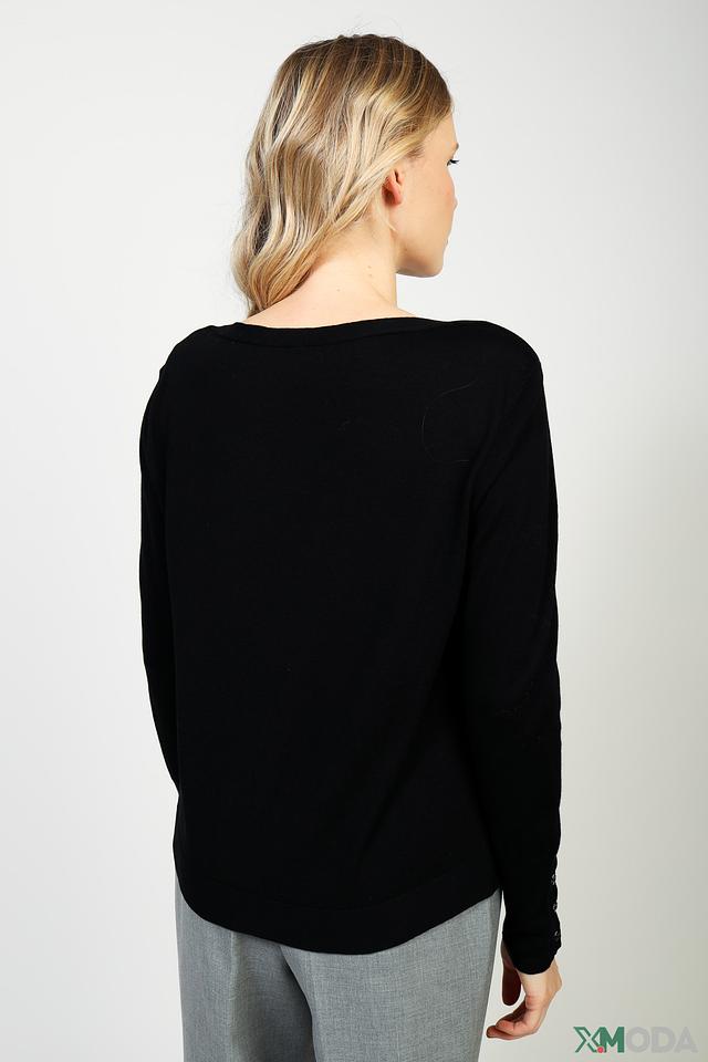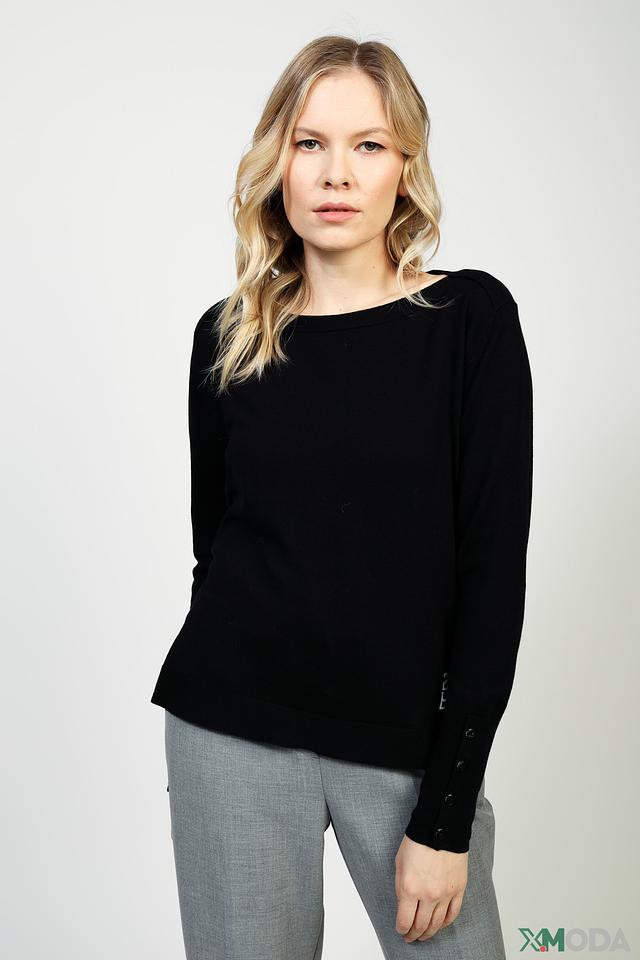 Чёрный пуловер Marc Cain из смесовой шерсти с декоративными пуговицами на рукавах. Модель имеет слегка заниженную линию плеч и вышитый логотип на рукаве, что придает ей особый стиль. Состав: шерсть 47%, вискоза 38%, полиамид 10%, кашемир 5%