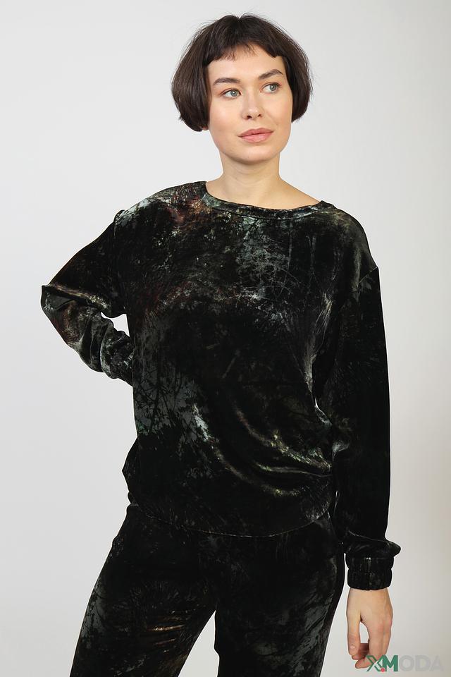 Основной цвет пуловера – чёрный, но его поверхность украшена оригинальным бархатистым принтом с абстрактными узорами в оттенках зелёного и коричневого. Такой рисунок делает этот пуловер уникальным и привлекательным.